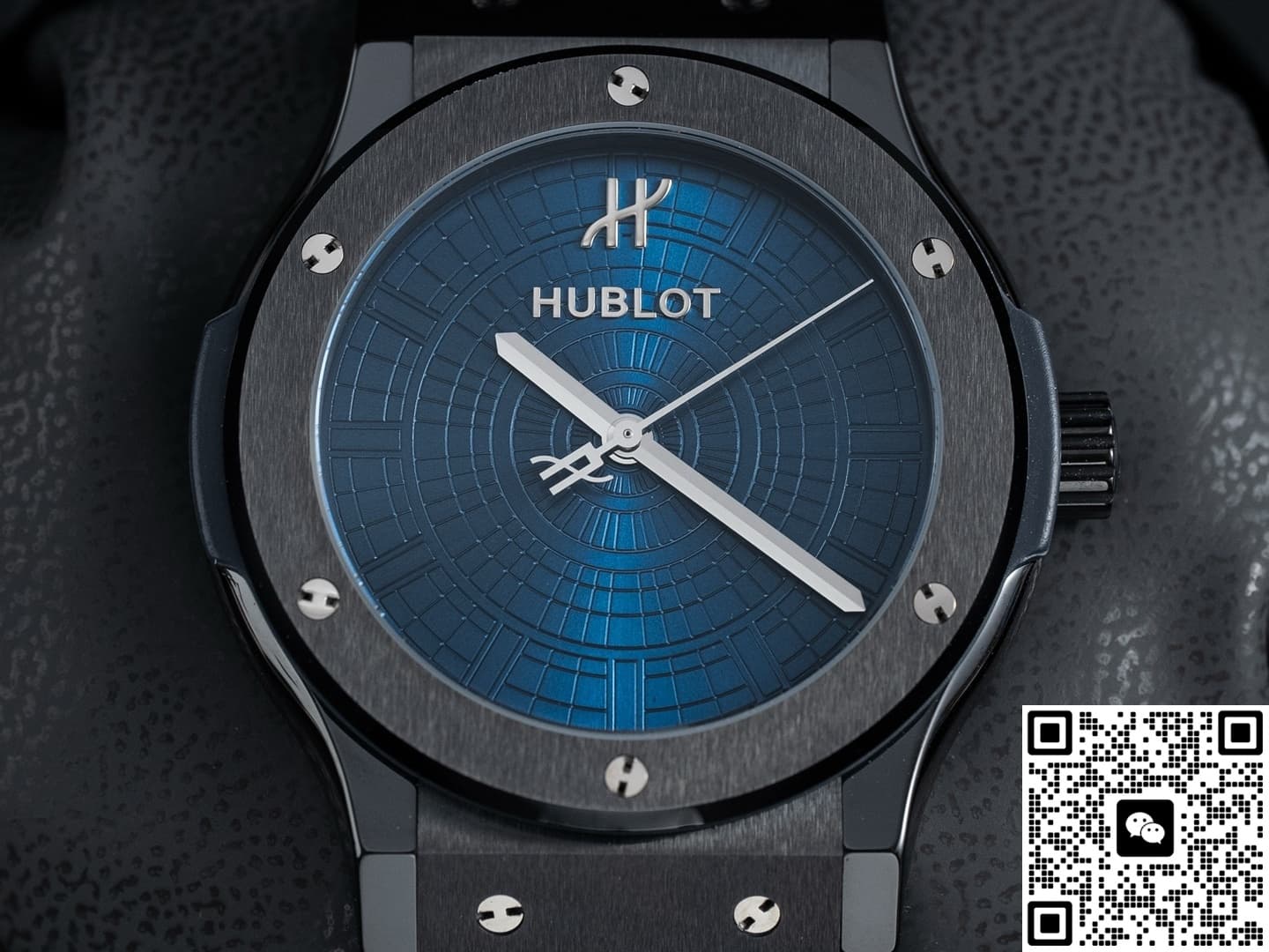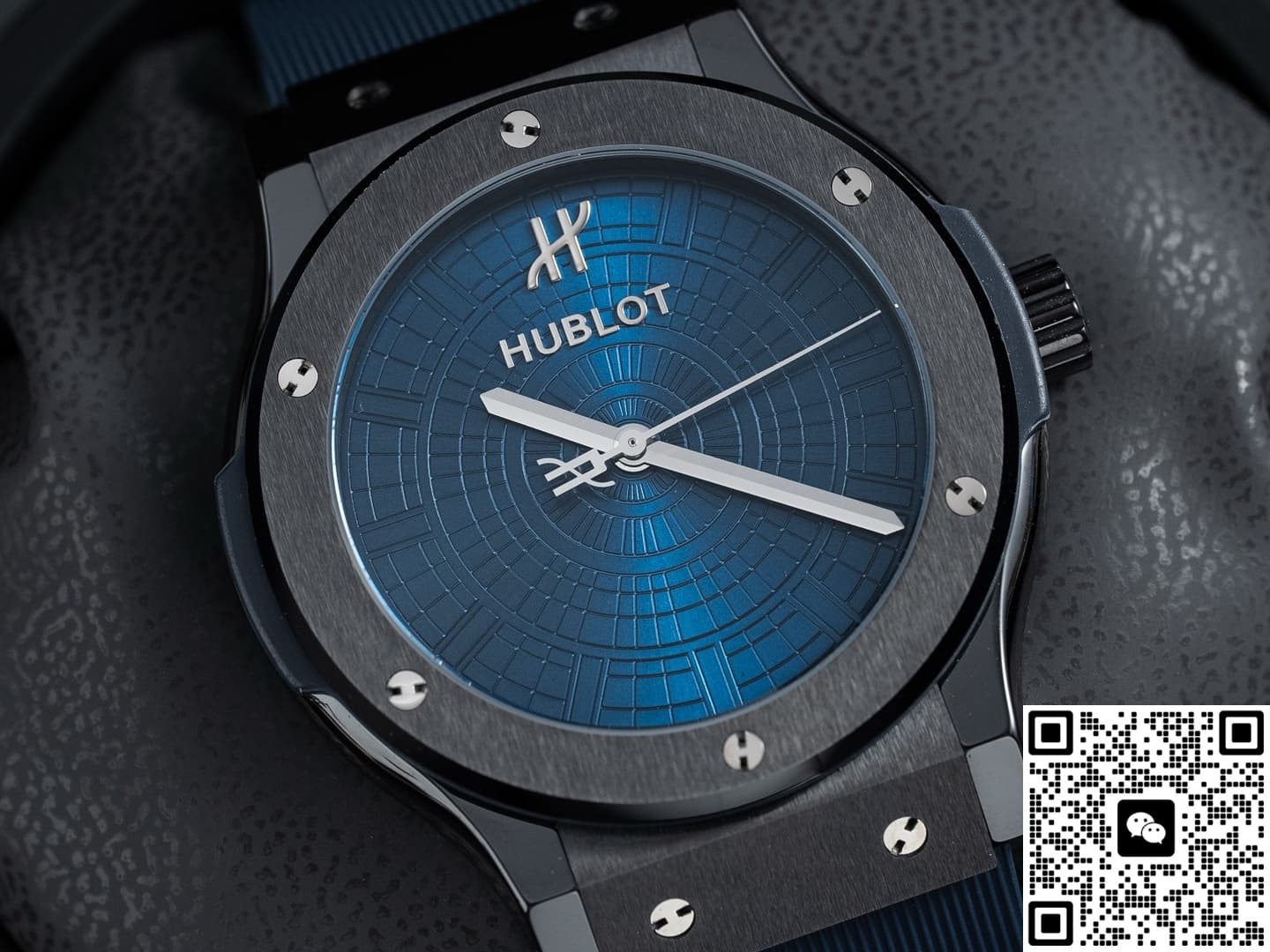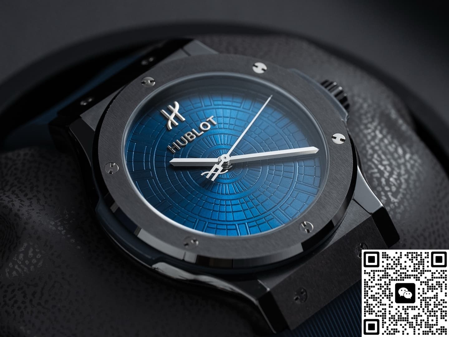 This Hublot Classic Fusion Pisa 1940 replica watch presses a deep blue sunburst pattern into its 42mm mirror-like dial. It’s like cutting the glass dome of Milan’s Galleria into a perfect circle, letting light bounce and refract within a hair’s breadth. No hour markers, no date window, no extra visual noise. The whole face is simplified down to just two hands and the unique Hublot logo, making the dial the sole focus and letting that dome texture breathe fully.