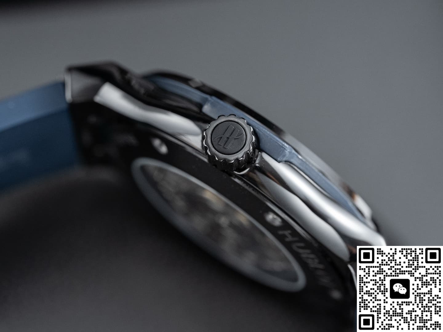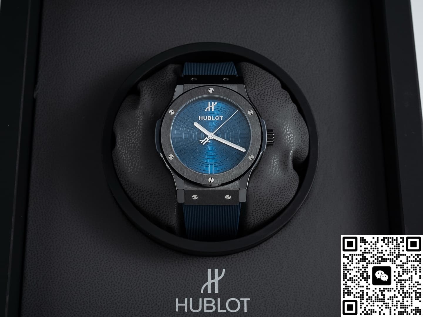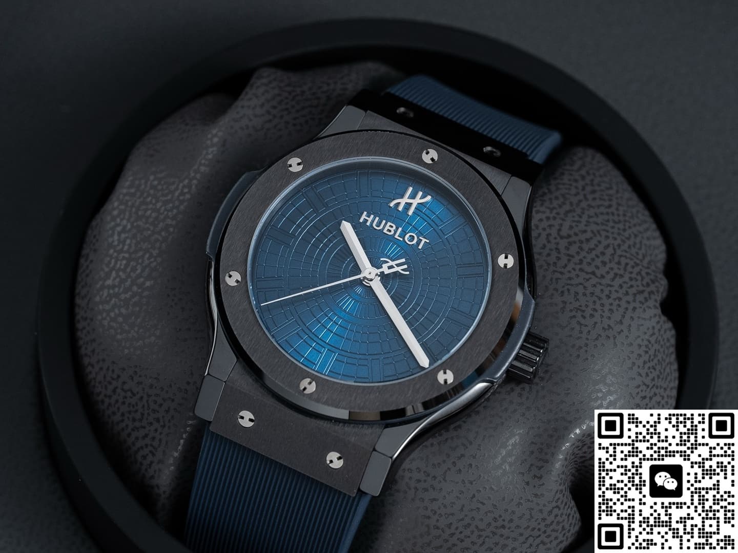 This Hublot Classic Fusion Pisa 1940 replica watch presses a deep blue sunburst pattern into its 42mm mirror-like dial. It’s like cutting the glass dome of Milan’s Galleria into a perfect circle, letting light bounce and refract within a hair’s breadth. No hour markers, no date window, no extra visual noise. The whole face is simplified down to just two hands and the unique Hublot logo, making the dial the sole focus and letting that dome texture breathe fully.