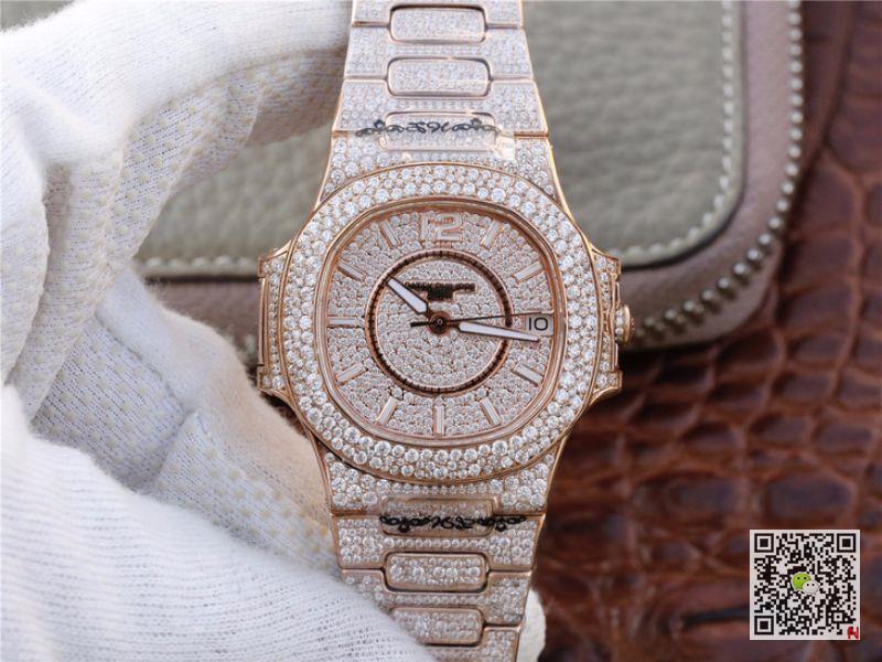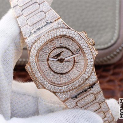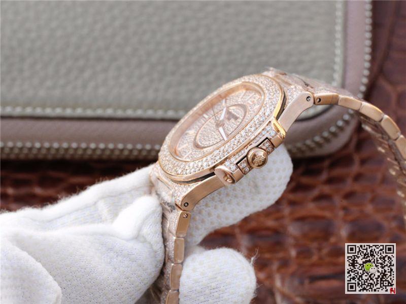 - R8 factory Replica Patek Philippe Nautilus Jumbo 5711 Tourbillon full diamond watch has unique and full of charm design, and it is the sublimation work which presenting perfect workmanship, and it is a symbol of successful person. Patek Philippe Nautilus Jumbo 5711 Tourbillon is equipped with Swiss manual winding tourbillon movement that is durable and run time preciously and stablely. And diameter is 40mm and thickness is 11mm which is suitable for people who has different wrist size. This Patek Philippe Nautilus Jumbo 5711 Tourbillon use 18K yellow gold plated rhinestone, sapphire double-side crystal mirror, 50 meters depth waterproof, and superstrong nightlight. Patek Philippe Nautilus Jumbo 5711 Tourbillon adopt 316L stainless steel plating 18K yellow gold and inlaid rhinestone watch case, that is never fading.