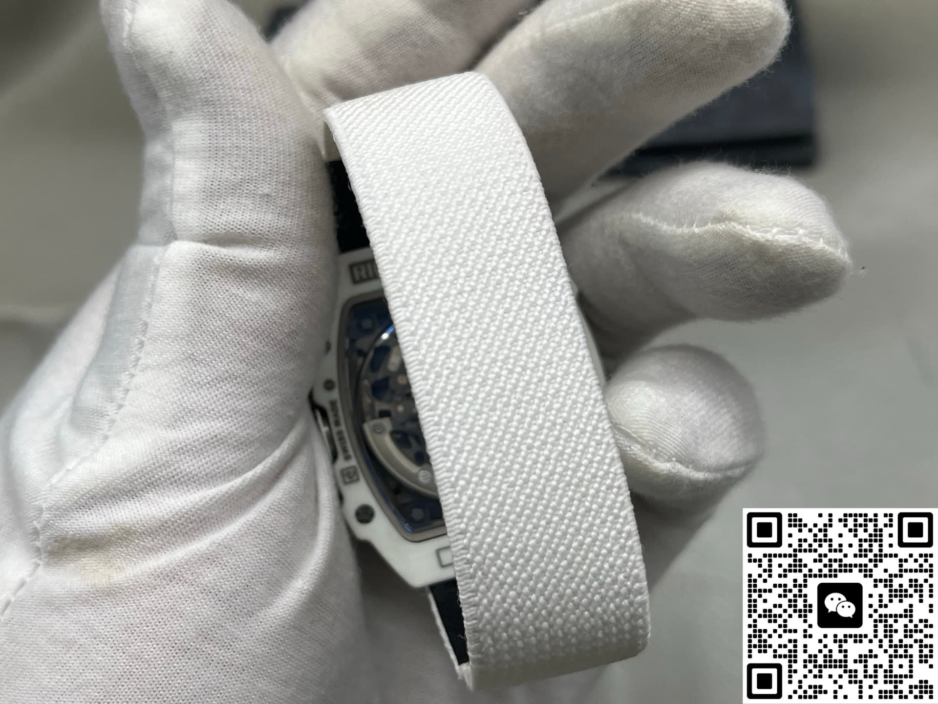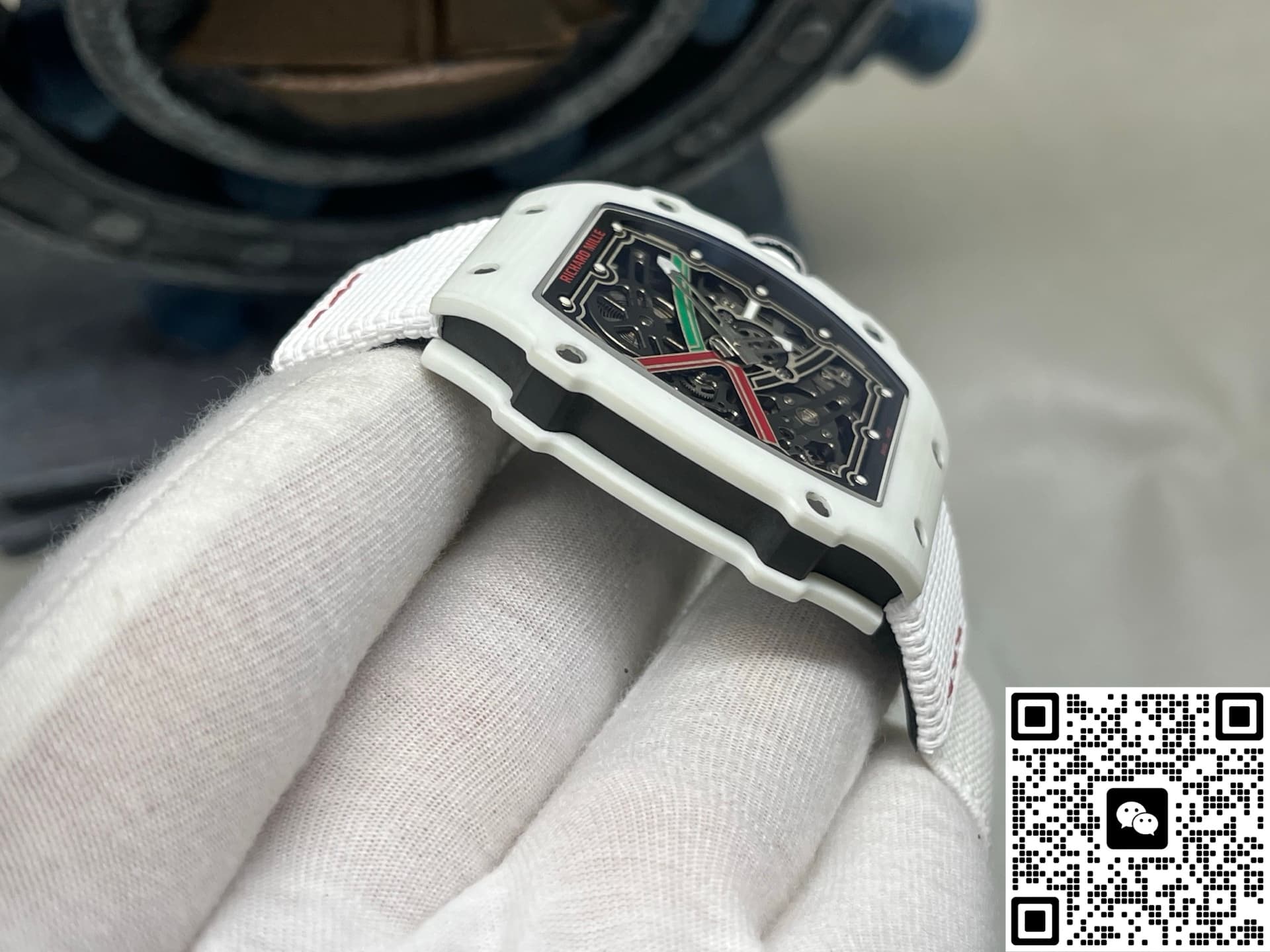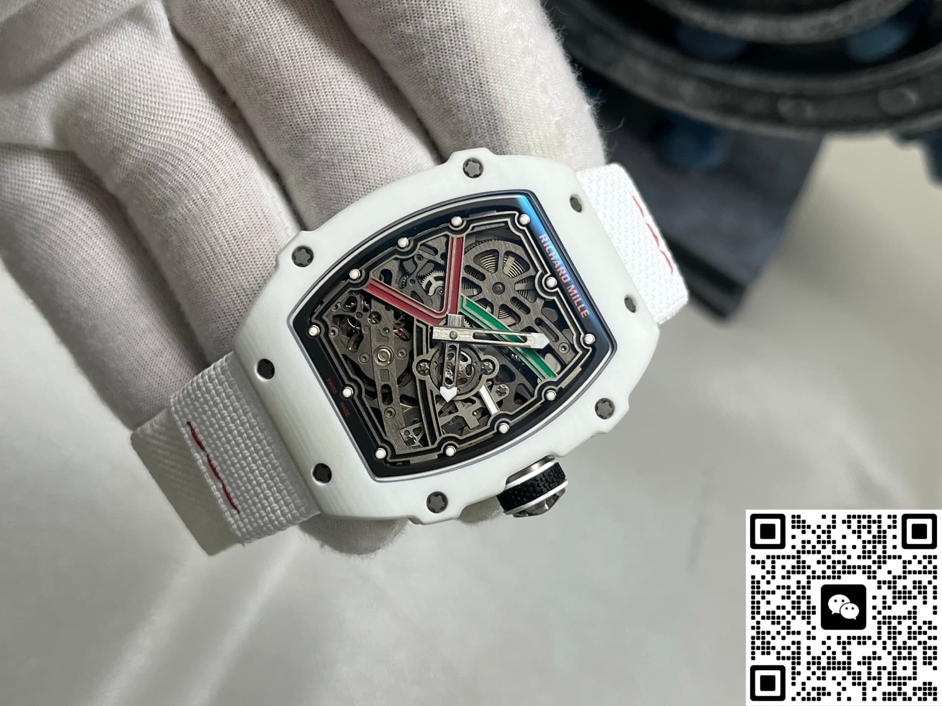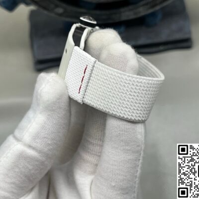 This watch recreates the skeletonized feel and intricate decoration of the original to a great extent. The base plate, bridges, and gear layout are very close to the original. It has a rich sense of layers and mechanical appeal. You can see the movement working underneath. Every detail on the dial has been carefully finished. The edges of the hands are clean, no rough bits. The case is made of white carbon fiber. Carbon fiber is known for being lightweight and scratch-resistant. The case has this futuristic tonneau shape with smoothly polished edges—no sharp or rough feeling. The strap is made of woven material, also in white. Both the strap and case use lightweight materials, so the watch is really light, almost no weight at all. Wearing it, you hardly feel it.