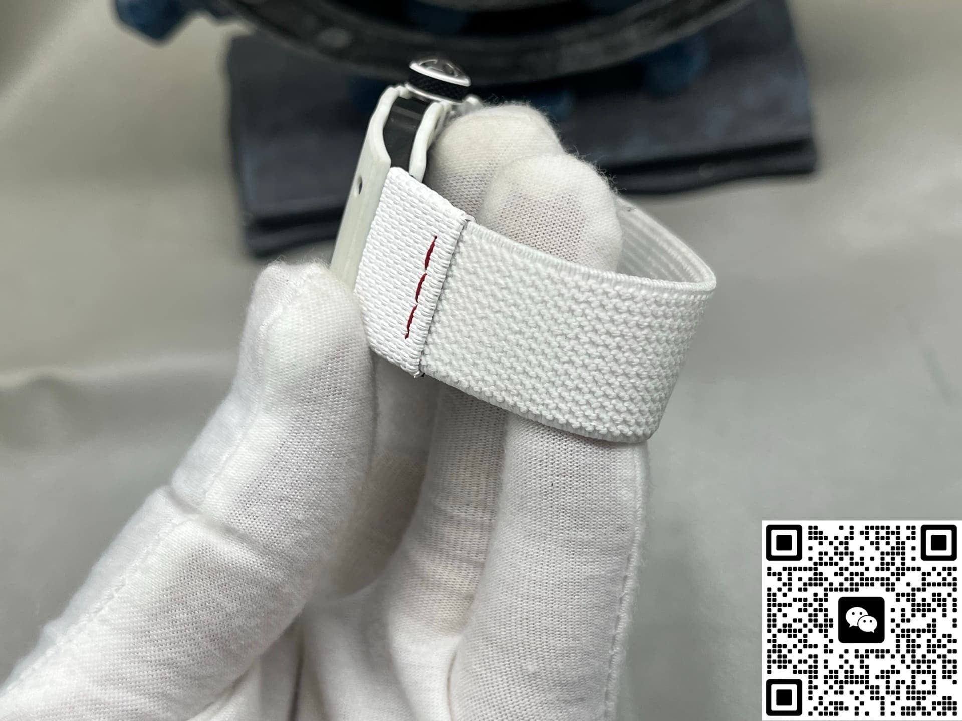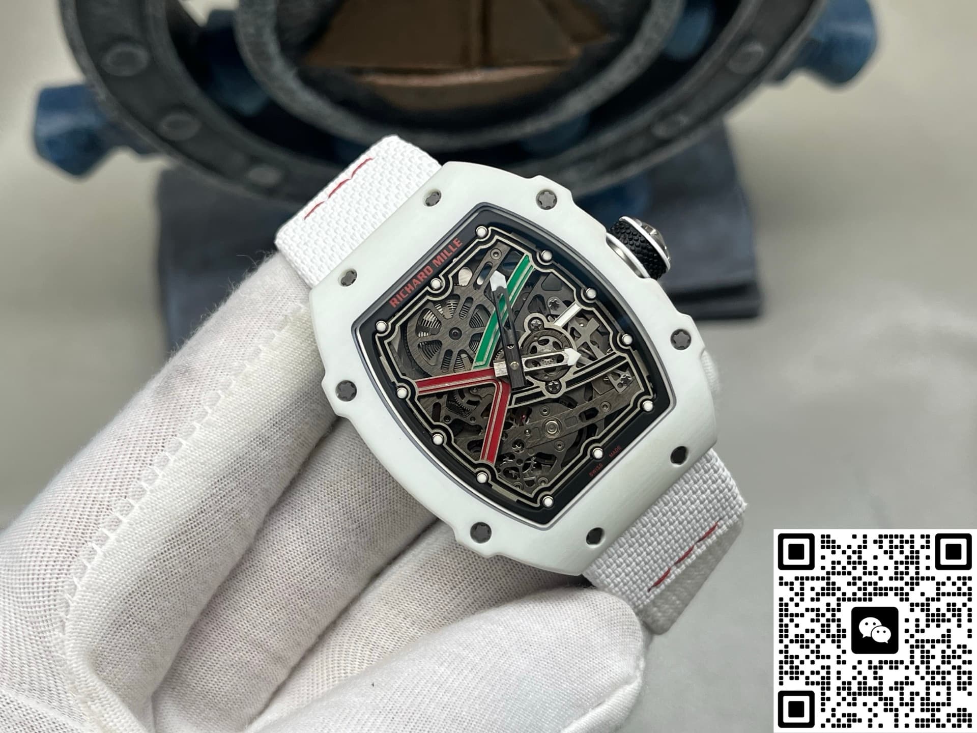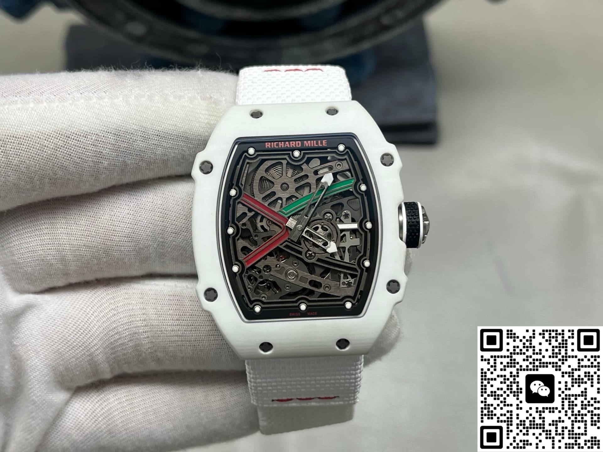 This watch recreates the skeletonized feel and intricate decoration of the original to a great extent. The base plate, bridges, and gear layout are very close to the original. It has a rich sense of layers and mechanical appeal. You can see the movement working underneath. Every detail on the dial has been carefully finished. The edges of the hands are clean, no rough bits. The case is made of white carbon fiber. Carbon fiber is known for being lightweight and scratch-resistant. The case has this futuristic tonneau shape with smoothly polished edges—no sharp or rough feeling. The strap is made of woven material, also in white. Both the strap and case use lightweight materials, so the watch is really light, almost no weight at all. Wearing it, you hardly feel it.