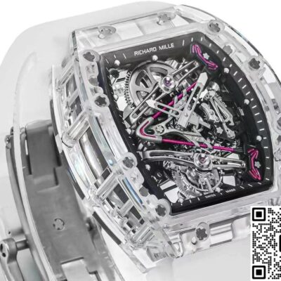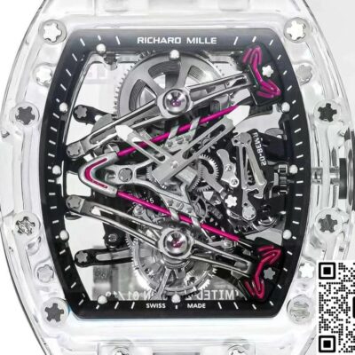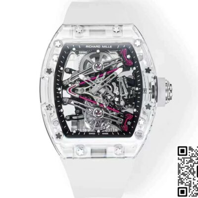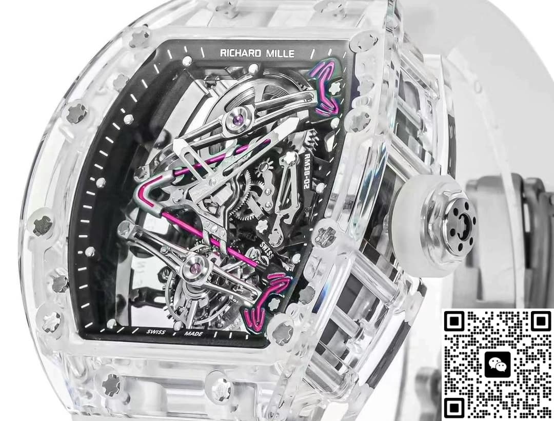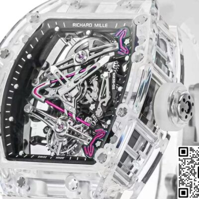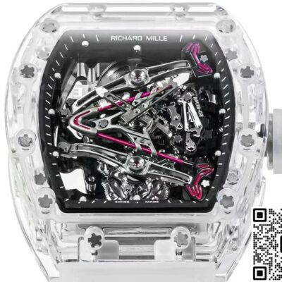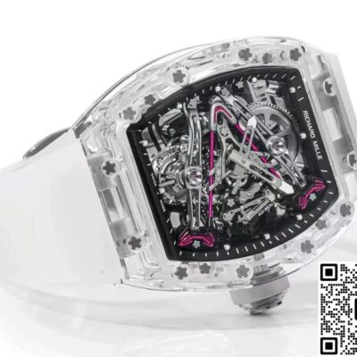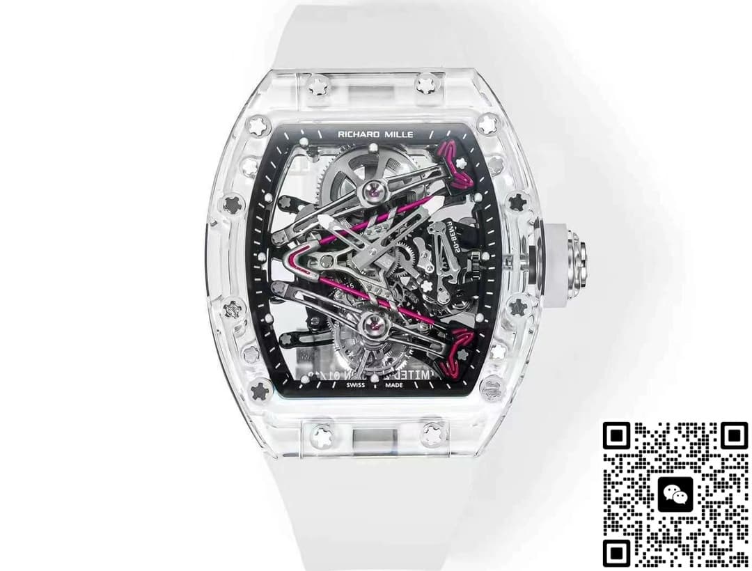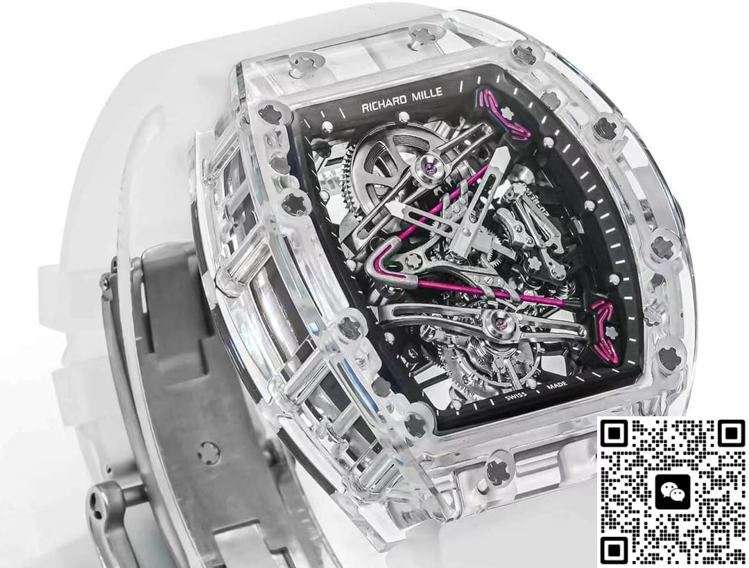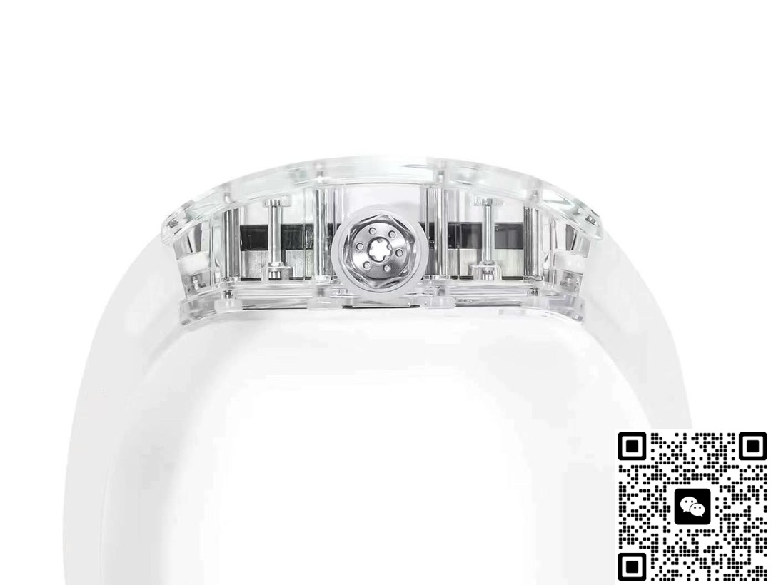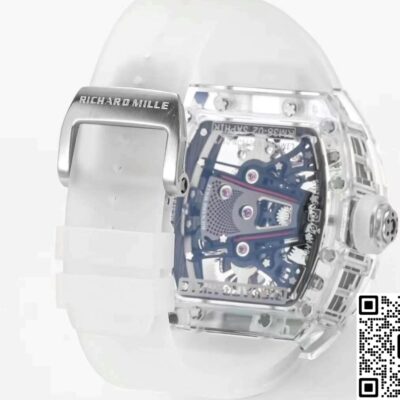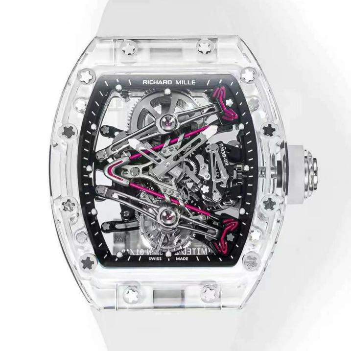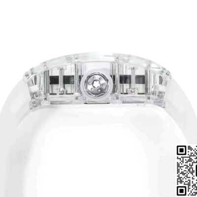 The watch case of this Richard Mille tourbillon clone watch is made of crystal material, which is an aviation-grade sapphire blank grown by melting method. The Mohs hardness reaches grade 9, and it is difficult for daily metal to leave traces. The watchband is also cut by solid sapphire, and then embedded in the axis of titanium metal, which ensures the transparency. The torsion resistance is six times that of ordinary fluororubber. In order to reduce the weight, the middle shell is hollowed out, and it will not stick to hands because of sweat stains in summer.