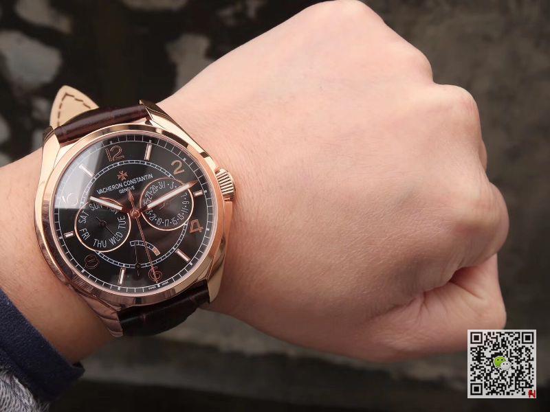 - The most difficult point in manufacturing case of replica Vacheron Constantin 4400E/000R/B436 is special-shaped components at the junction of middle case and bezel, the thickness of thinnest part is only 0.4mm and in polishing and stamping process is very easy to deform and bend that required high manufacture craftsmanship. Each finished watch case not only is time-consuming and laborious, but also embodies the patience and perseverance of watchmaker. Two-tone dial after many times modify color matching, really restore original color tone, 6 fine scale marks adopt integrated finished scale sticks that use CNC cutting forming and superstrong nightlight display, not fear night environment. The movement of replica Vacheron Constantin 4400E/000R/B436 watches is independent researched and developed, not only structure is consistent with original, but also the hand feeling of winding, operating poointers and time adjusting function are full coincidence. Embedded calfskin leather strap match original folding clasp, and closely connected to the watch shoulder, make the wearer feel more comfortable and fitting hand.