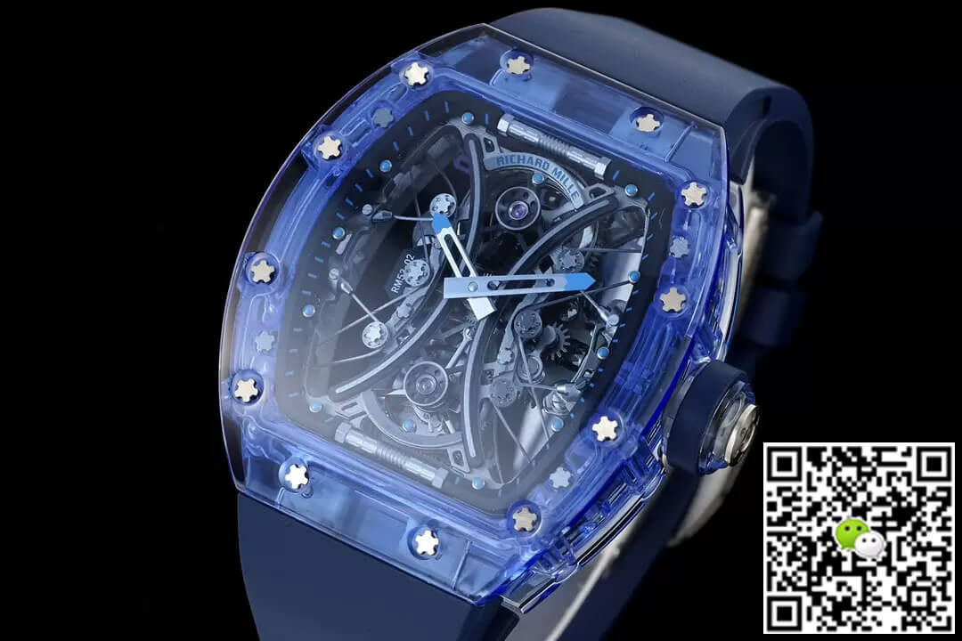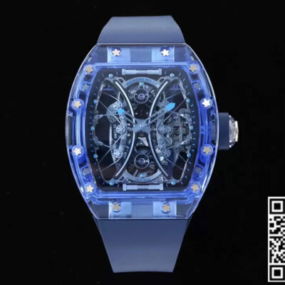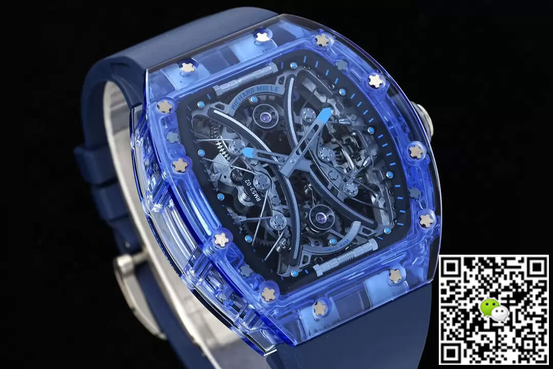 Best RM Factory Replica Richard Mille RM053-02 Tourbillon Blue Rubber Strap For Sale – Replica Watch Wholesale.This is a fully transparent watch with a sapphire crystal case that is extremely wear-resistant. Tourbillon movement customized to Swiss standards. It also uses a rubber strap imported from Indonesia and is designed based on the real RM factory strap, giving you a different wearing experience. Not only is it beautifully crafted, it’s also very sophisticated and practical.