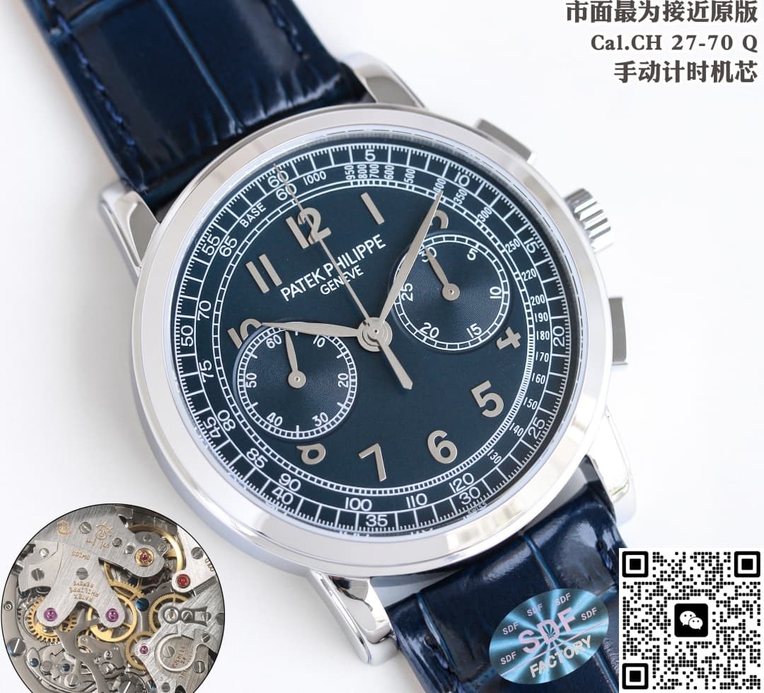 The SDF factory’s version of the Patek Philippe Complications series 5070P replica watch is the closest you can get to the original on the market. Whether it’s the watch’s appearance or its various functions, it performs excellently. The deep blue dial looks really beautiful in person, giving off a calm and elegant vibe. Paired with a matching deep blue leather strap, it’s visually very harmonious and natural. The 42mm case size is equivalent to the original, fitting most men’s wrists perfectly. Wearing it instantly boosts your presence, and it’s also incredibly versatile—whether for daily office wear, casual outings, dates, or attending business events, it easily fits all these occasions. Below, I’ll break down the details for you!