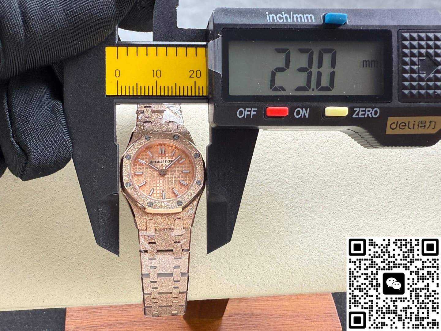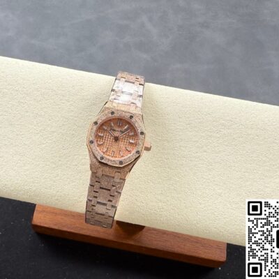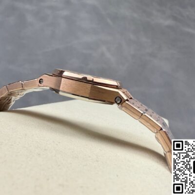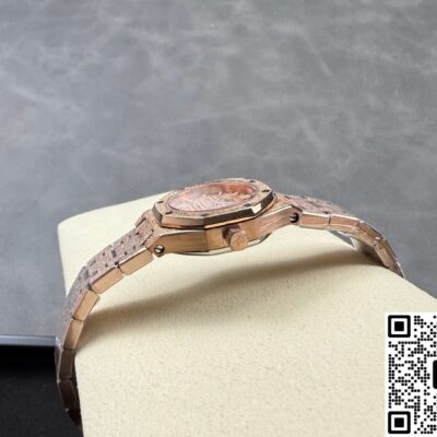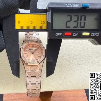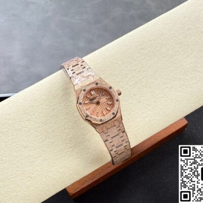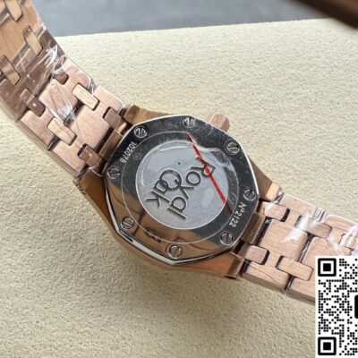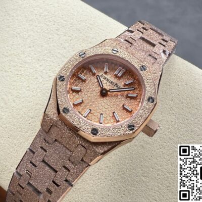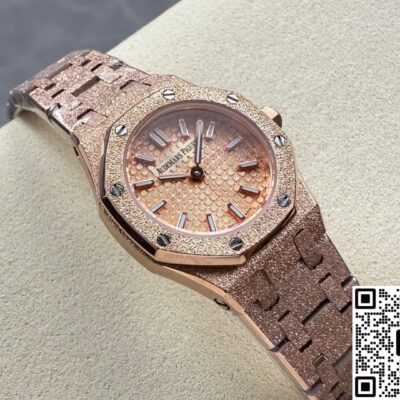 Okay, so this Audemars Piguet Royal Oak 67630OR.GG.1312OR.01 replica watch is from SPX factory. It’s a quartz watch. Some people might say, why is such an expensive watch using quartz? Not worth it. But I think the high price has its reasons. Plus, quartz watches don’t need winding—as long as the battery has power, the watch won’t stop. It’s super accurate, can have 0 seconds error per day. And maintenance later on is cheap, just change the battery for a few hundred bucks and it’s done. This watch is a ladies’ model, the size is only 23mm, really small and delicate. Perfect for girls with slim wrists. The whole watch is rose gold, the tone is warm and soft, makes your skin tone look good. And the whole watch is finished with frost gold technique. The visual impact is strong, really beautiful and classy. This watch is very light, wearing it on the wrist feels like nothing. I actually like this watch a lot. Now let’s take a closer look at the details and workmanship.