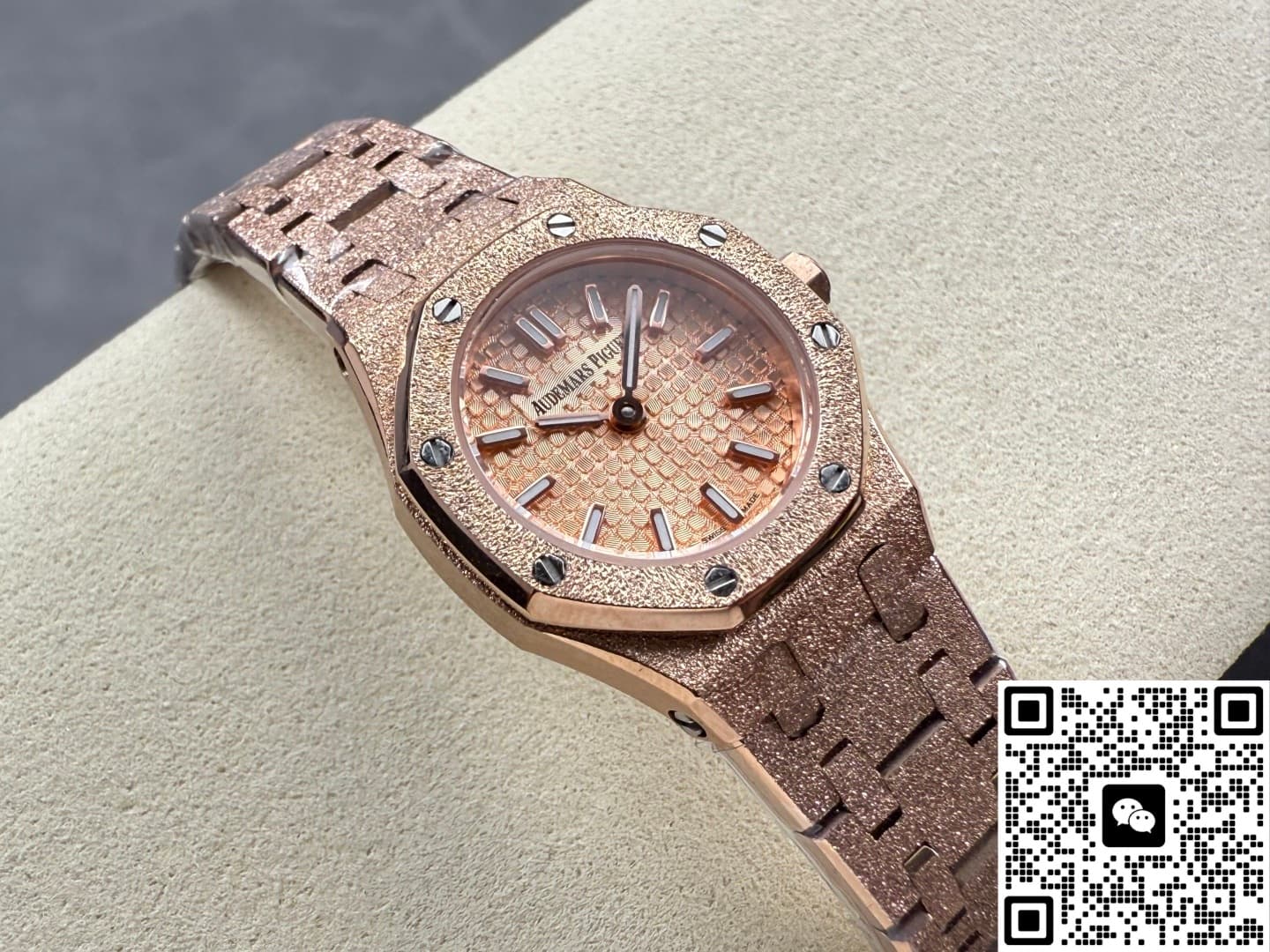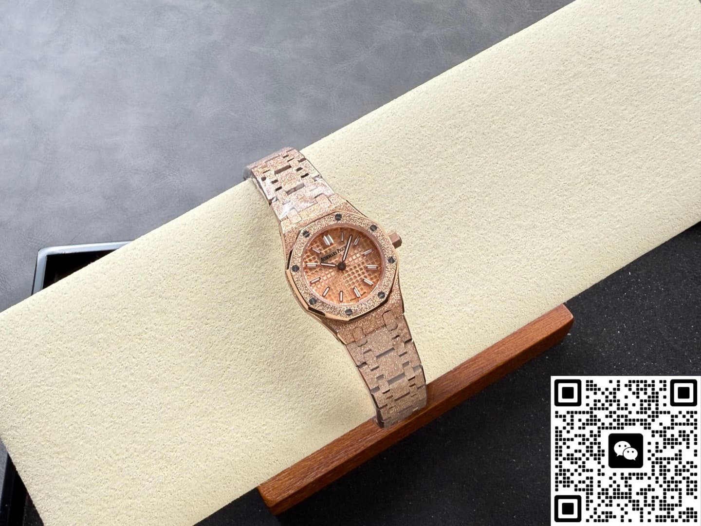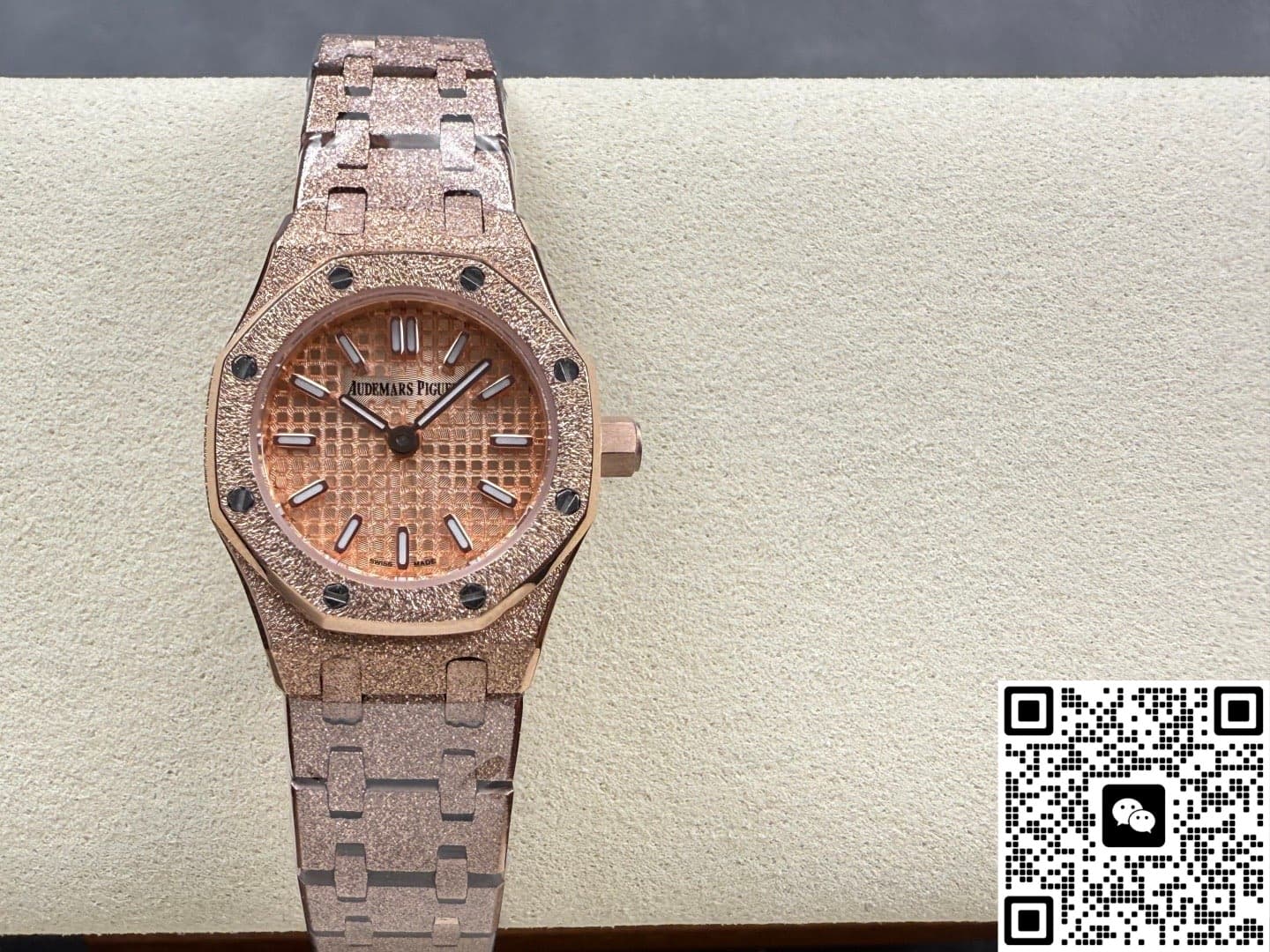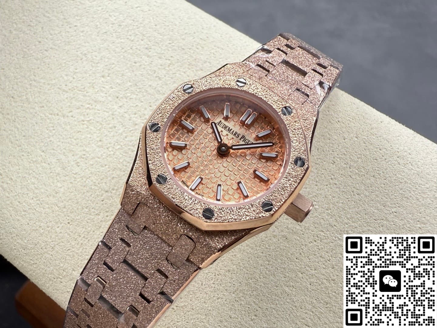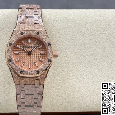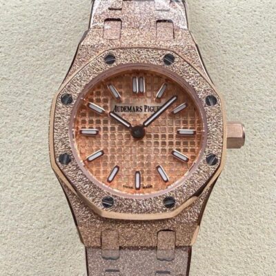 Okay, so this Audemars Piguet Royal Oak 67630OR.GG.1312OR.01 replica watch is from SPX factory. It’s a quartz watch. Some people might say, why is such an expensive watch using quartz? Not worth it. But I think the high price has its reasons. Plus, quartz watches don’t need winding—as long as the battery has power, the watch won’t stop. It’s super accurate, can have 0 seconds error per day. And maintenance later on is cheap, just change the battery for a few hundred bucks and it’s done. This watch is a ladies’ model, the size is only 23mm, really small and delicate. Perfect for girls with slim wrists. The whole watch is rose gold, the tone is warm and soft, makes your skin tone look good. And the whole watch is finished with frost gold technique. The visual impact is strong, really beautiful and classy. This watch is very light, wearing it on the wrist feels like nothing. I actually like this watch a lot. Now let’s take a closer look at the details and workmanship.