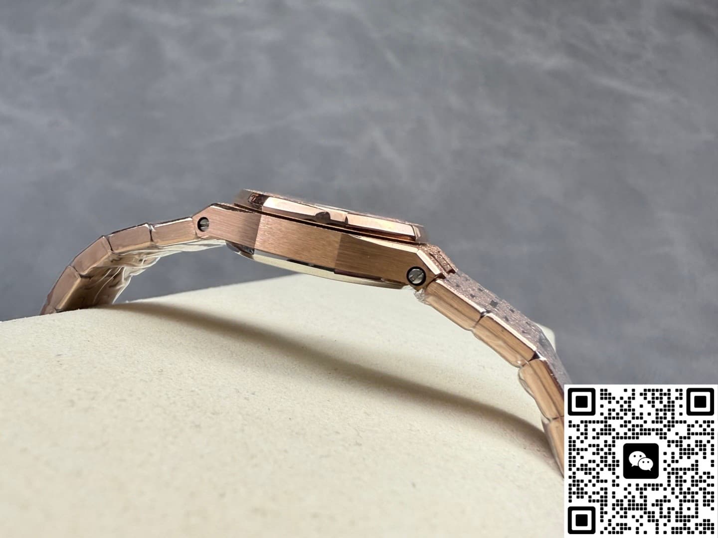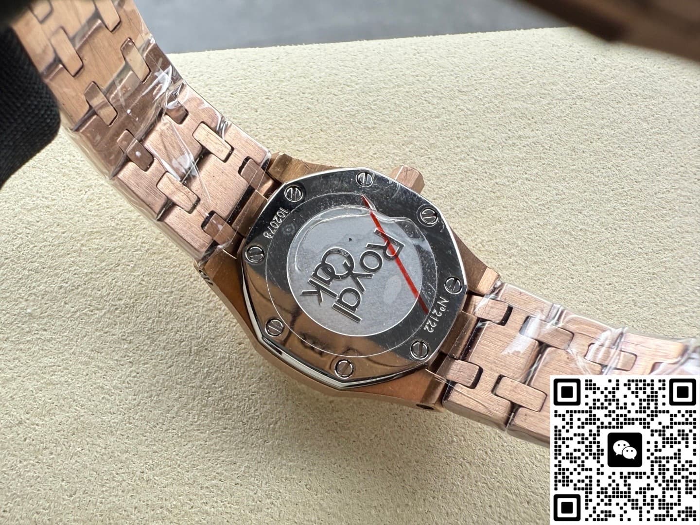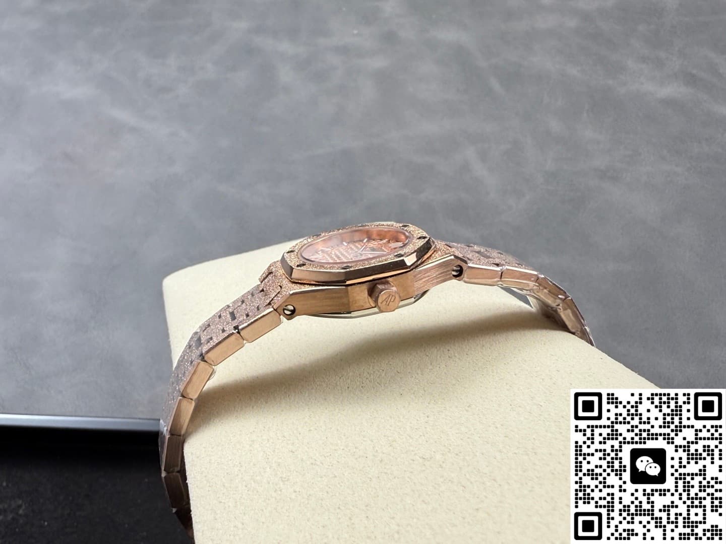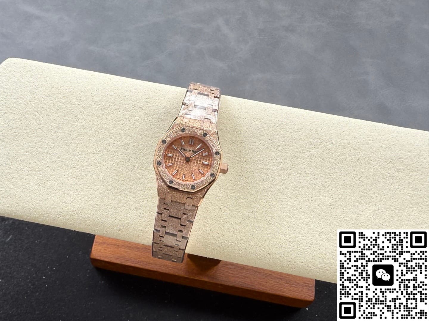 Okay, so this Audemars Piguet Royal Oak 67630OR.GG.1312OR.01 replica watch is from SPX factory. It’s a quartz watch. Some people might say, why is such an expensive watch using quartz? Not worth it. But I think the high price has its reasons. Plus, quartz watches don’t need winding—as long as the battery has power, the watch won’t stop. It’s super accurate, can have 0 seconds error per day. And maintenance later on is cheap, just change the battery for a few hundred bucks and it’s done. This watch is a ladies’ model, the size is only 23mm, really small and delicate. Perfect for girls with slim wrists. The whole watch is rose gold, the tone is warm and soft, makes your skin tone look good. And the whole watch is finished with frost gold technique. The visual impact is strong, really beautiful and classy. This watch is very light, wearing it on the wrist feels like nothing. I actually like this watch a lot. Now let’s take a closer look at the details and workmanship.