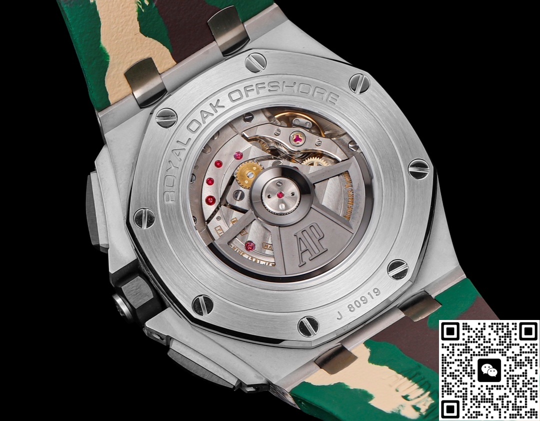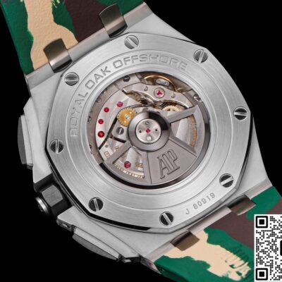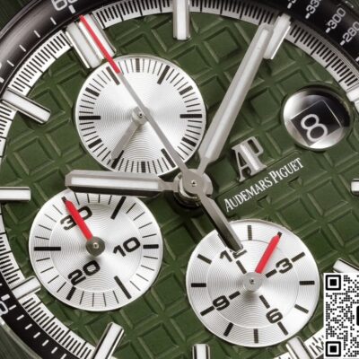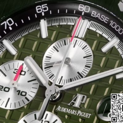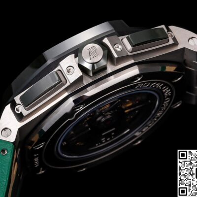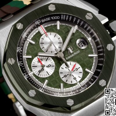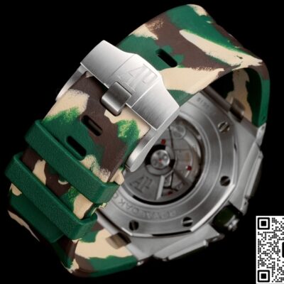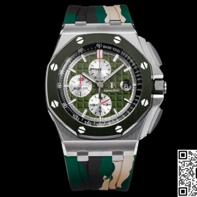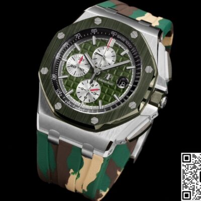 Today, we bring you the TK Factory’s Audemars Piguet Royal Oak Offshore 26400SO.OO.A055CA.01. The most striking feature of this watch is its khaki green ceramic case and bezel, which exude unique charm under different lighting conditions. The dial appears somewhat complex at first glance, but upon closer inspection, it reveals a simpler design—a sporty watch with a racing-inspired style. The watch is robust and substantial, with a 44mm diameter, making it a good fit for those with larger frames. This Audemars Piguet Royal Oak watch is elegant yet refined, exuding a sense of grandeur. The camouflage strap adds a touch of freedom and spontaneity. The eight platinum hexagonal screws on the bezel contrast beautifully with the khaki green main body, resembling twinkling stars in the night sky, unique and captivating. I fell in love with it at first sight. Now, let’s take a closer look at how this Audemars Piguet replica from TK Factory performs.