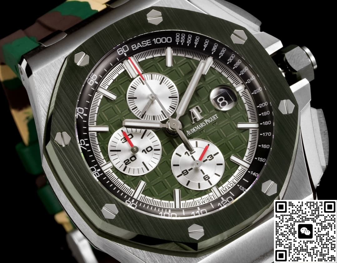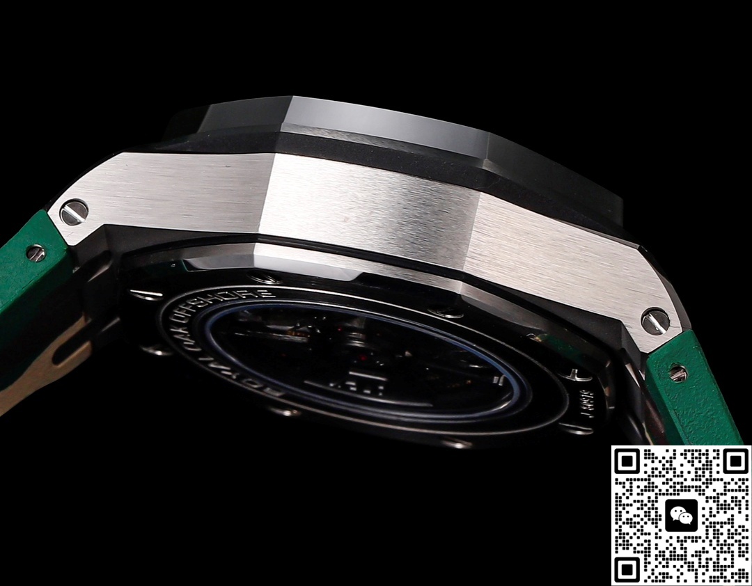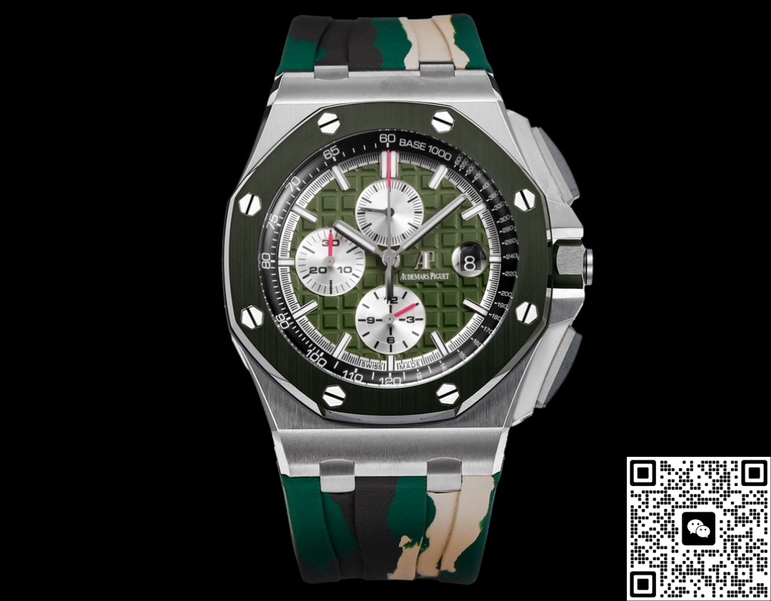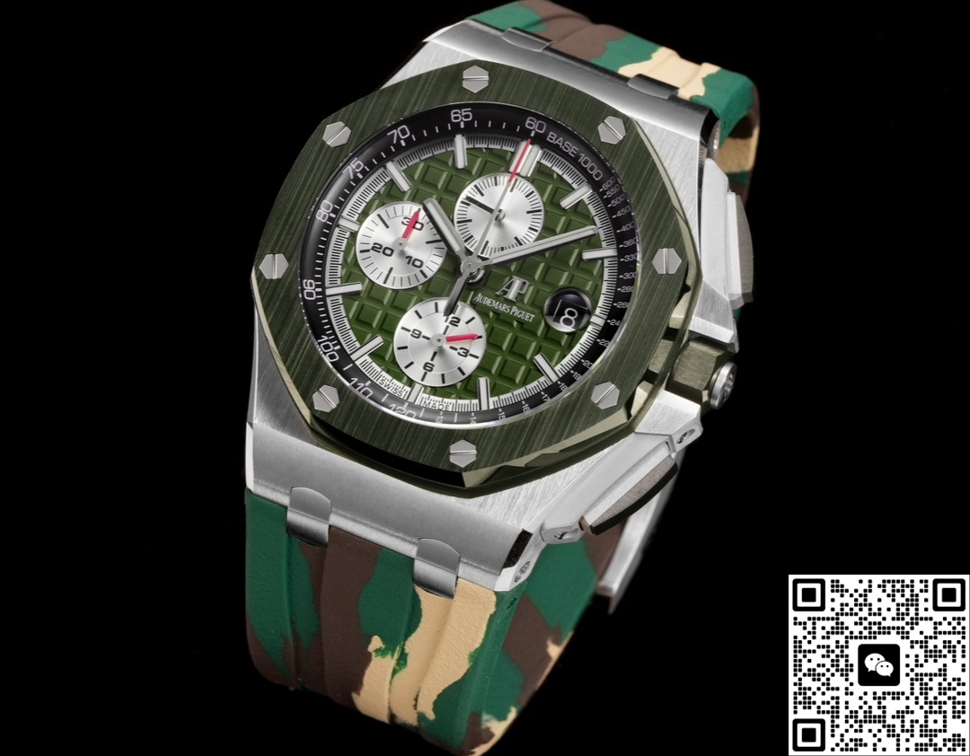 Today, we bring you the TK Factory’s Audemars Piguet Royal Oak Offshore 26400SO.OO.A055CA.01. The most striking feature of this watch is its khaki green ceramic case and bezel, which exude unique charm under different lighting conditions. The dial appears somewhat complex at first glance, but upon closer inspection, it reveals a simpler design—a sporty watch with a racing-inspired style. The watch is robust and substantial, with a 44mm diameter, making it a good fit for those with larger frames. This Audemars Piguet Royal Oak watch is elegant yet refined, exuding a sense of grandeur. The camouflage strap adds a touch of freedom and spontaneity. The eight platinum hexagonal screws on the bezel contrast beautifully with the khaki green main body, resembling twinkling stars in the night sky, unique and captivating. I fell in love with it at first sight. Now, let’s take a closer look at how this Audemars Piguet replica from TK Factory performs.
