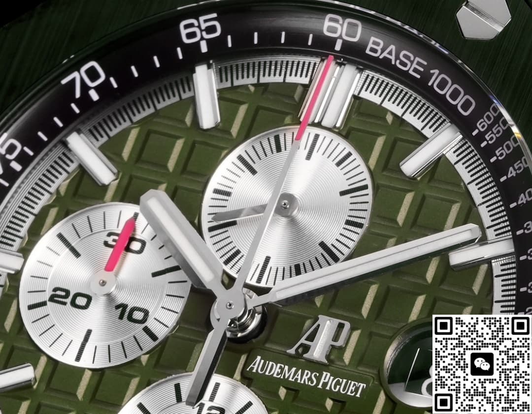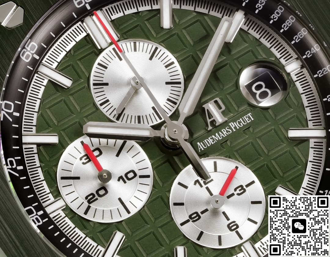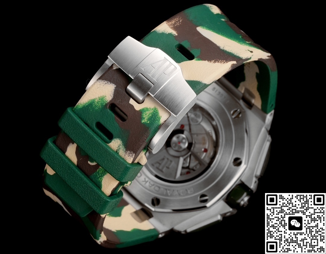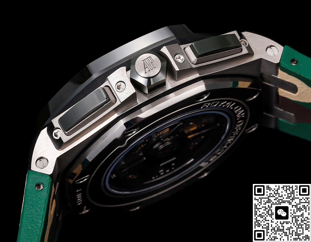 Today, we bring you the TK Factory’s Audemars Piguet Royal Oak Offshore 26400SO.OO.A055CA.01. The most striking feature of this watch is its khaki green ceramic case and bezel, which exude unique charm under different lighting conditions. The dial appears somewhat complex at first glance, but upon closer inspection, it reveals a simpler design—a sporty watch with a racing-inspired style. The watch is robust and substantial, with a 44mm diameter, making it a good fit for those with larger frames. This Audemars Piguet Royal Oak watch is elegant yet refined, exuding a sense of grandeur. The camouflage strap adds a touch of freedom and spontaneity. The eight platinum hexagonal screws on the bezel contrast beautifully with the khaki green main body, resembling twinkling stars in the night sky, unique and captivating. I fell in love with it at first sight. Now, let’s take a closer look at how this Audemars Piguet replica from TK Factory performs.