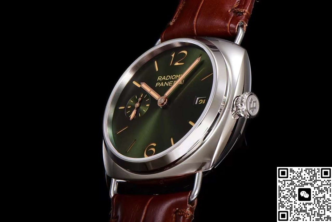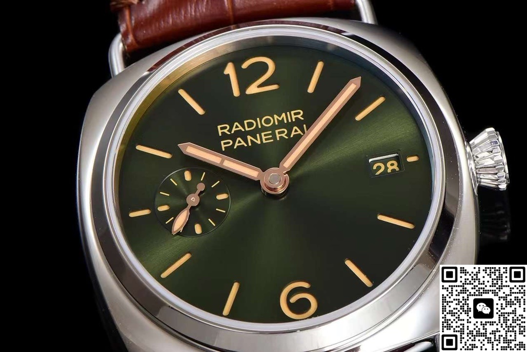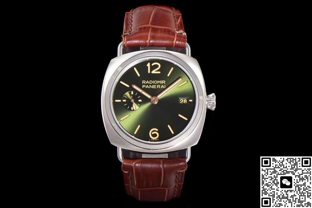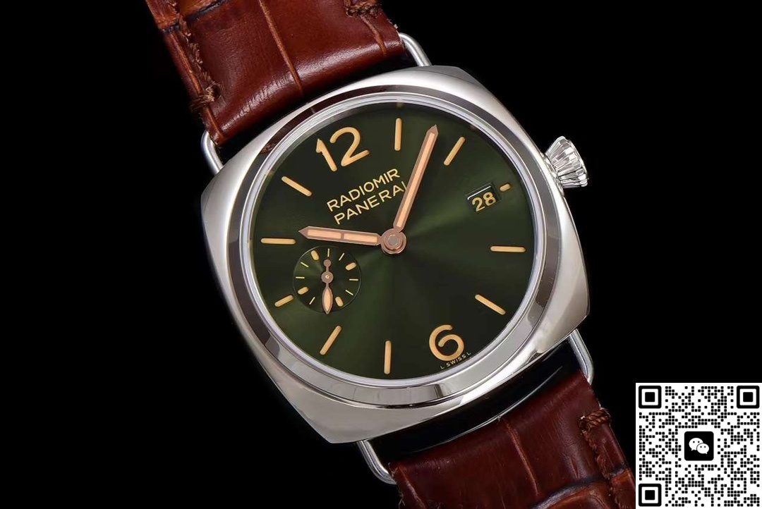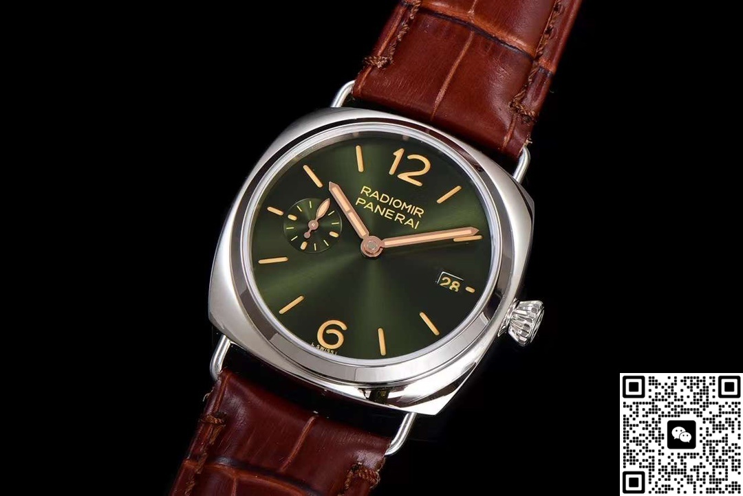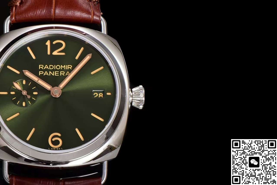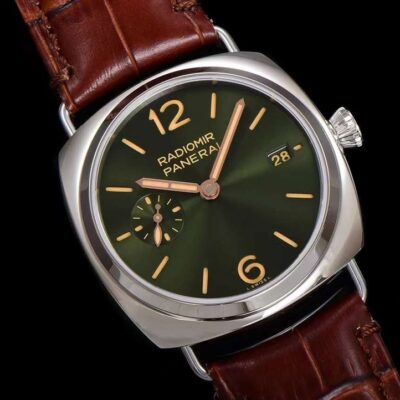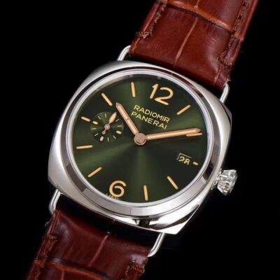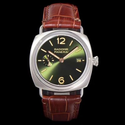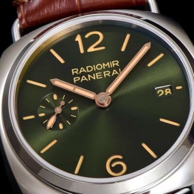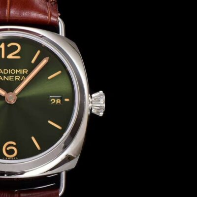 Today, let’s talk about this Panerai Luminor Due PAM01386 replica watch from TT Factory. The first look when you get it is really stunning. The green dial paired with the matte dark brown strap is eye-catching and retro. The actual piece is very beautiful. The golden hour markers and hands are small and delicate, adding an elegant, vintage, and high-class feel against the green dial. The crystal uses sapphire glass—clear and bright—so you can see every detail on the dial clearly. The quality of this Panerai is really good. Now, let’s take a closer look.