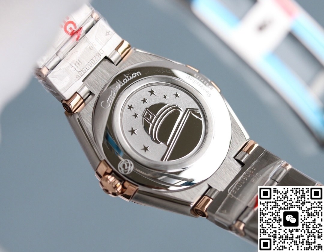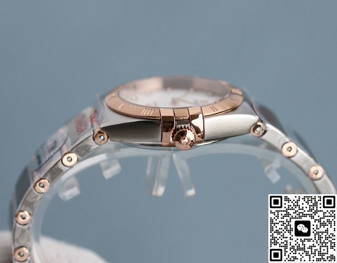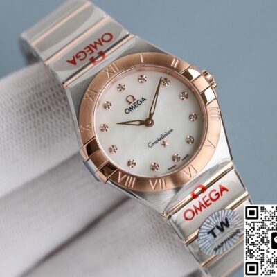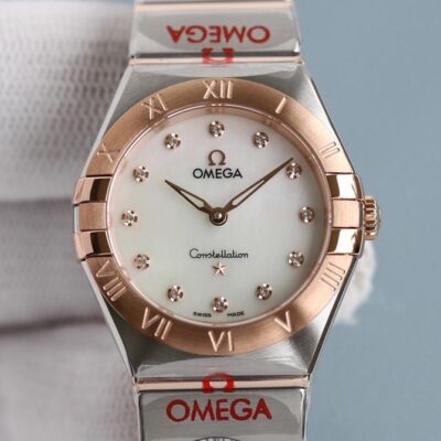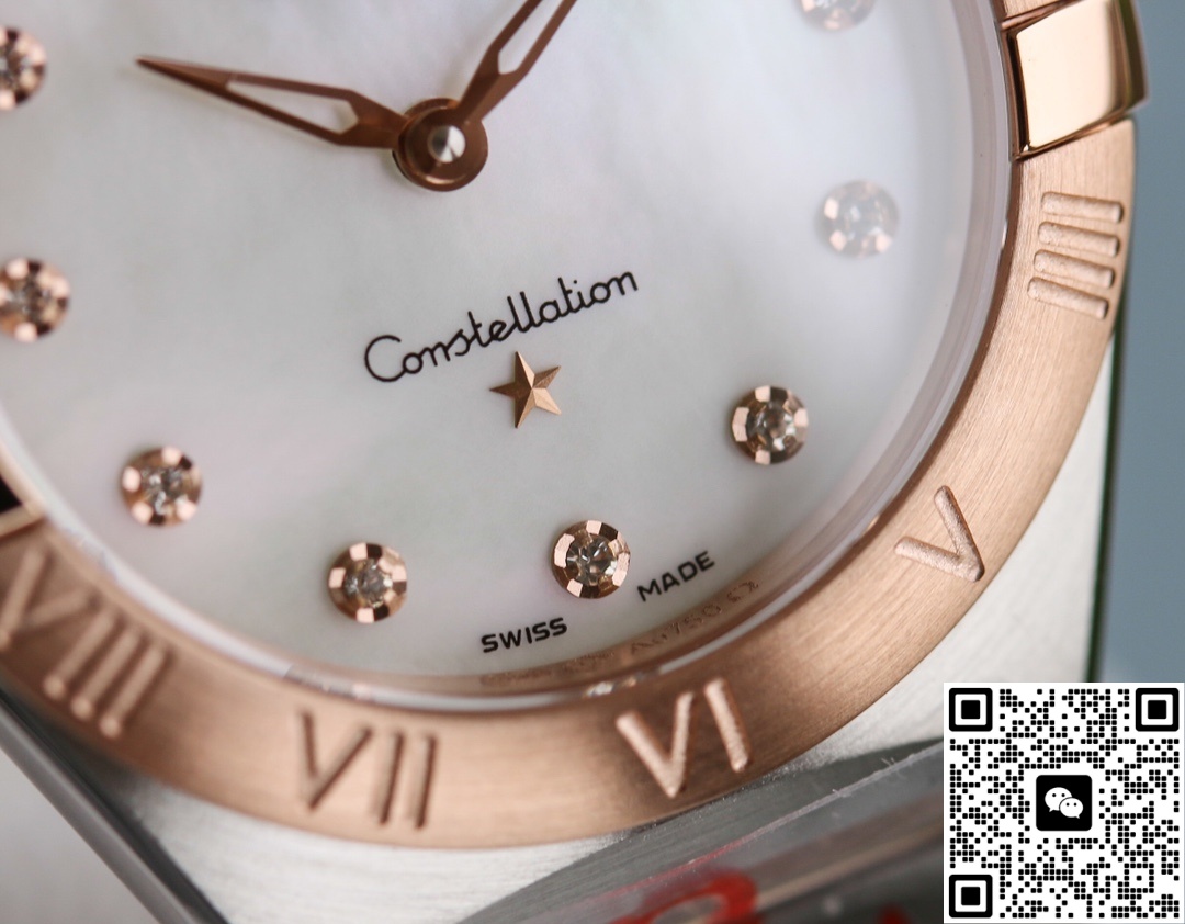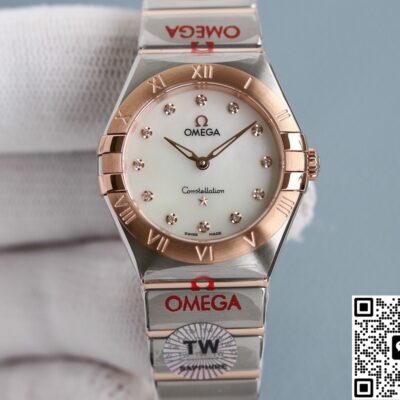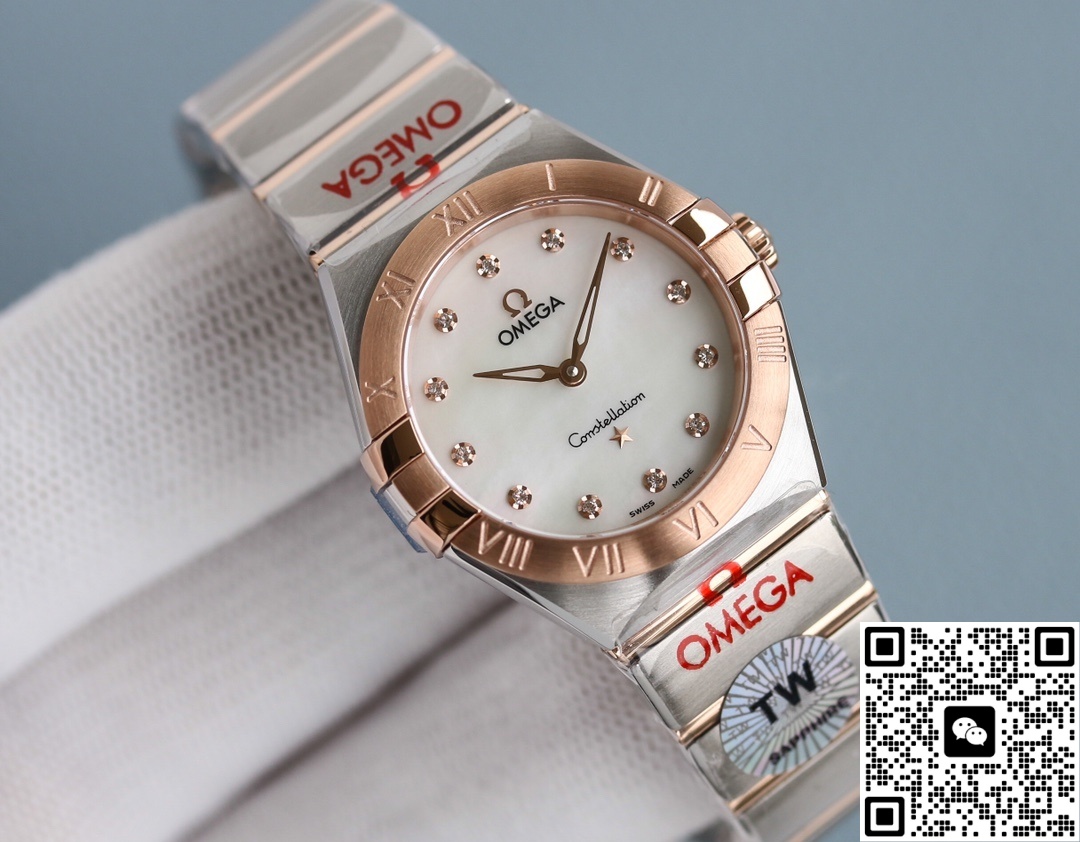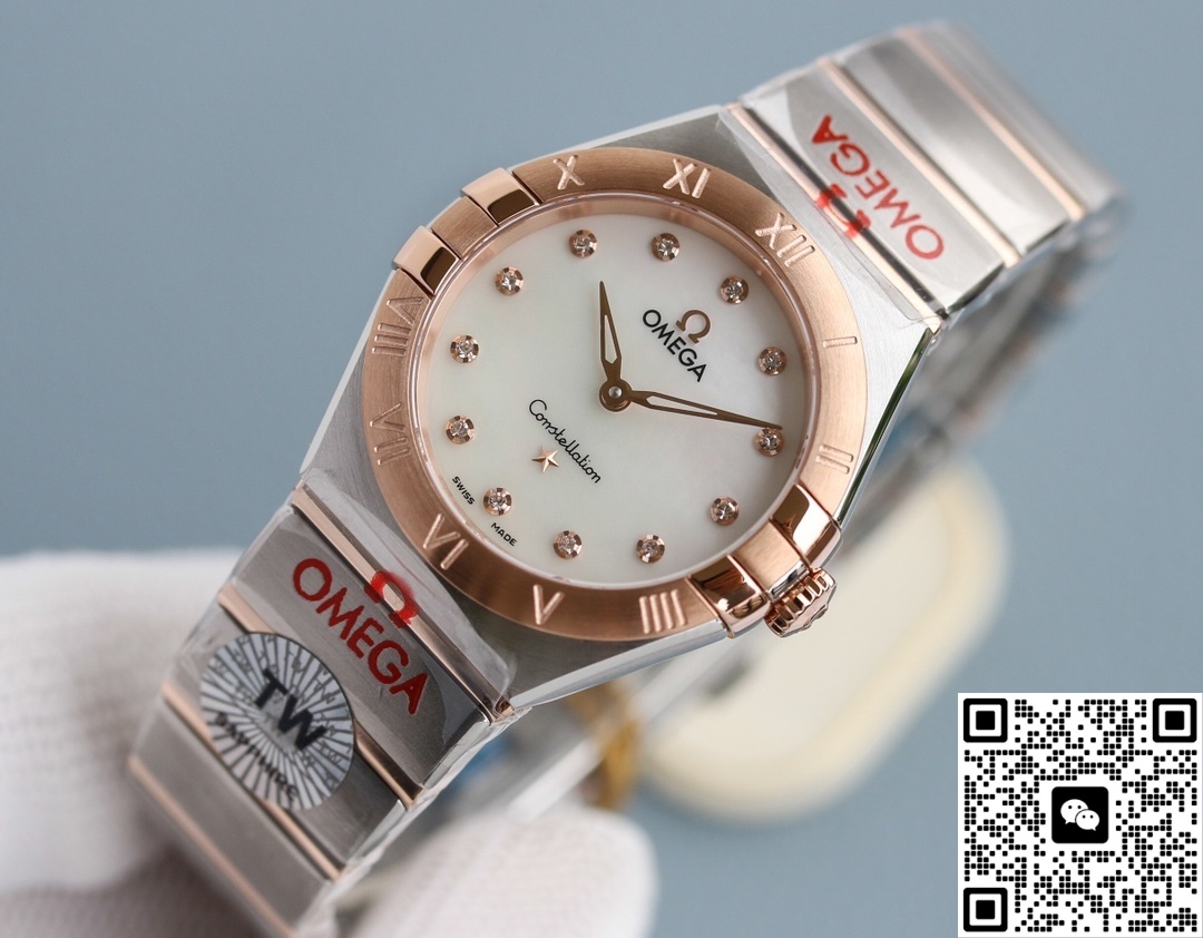 - Every component of TW factory Omega Constellation Ladies 27mm quartz watch is opened mold 1:1 according to original, and every component can be exchanged with original. The TW factory Omega Constellation Ladies 27mm quartz replica watch adopt Swiss clone original Omega 1376 exclusive movement. The whole watch adopt 18K rosegold plated on 316L stainless steel that is never fading, and the dial is 18K rosegold plated and full paved diamonds. The crown of Omega Constellation Ladies 27mm quartz watch use inner hexagonal screw-in crown that is of better waterproof performance. The watch mirror glass is plated air double-side colourless antireflective film, so that the mirror is perfect transparency.
