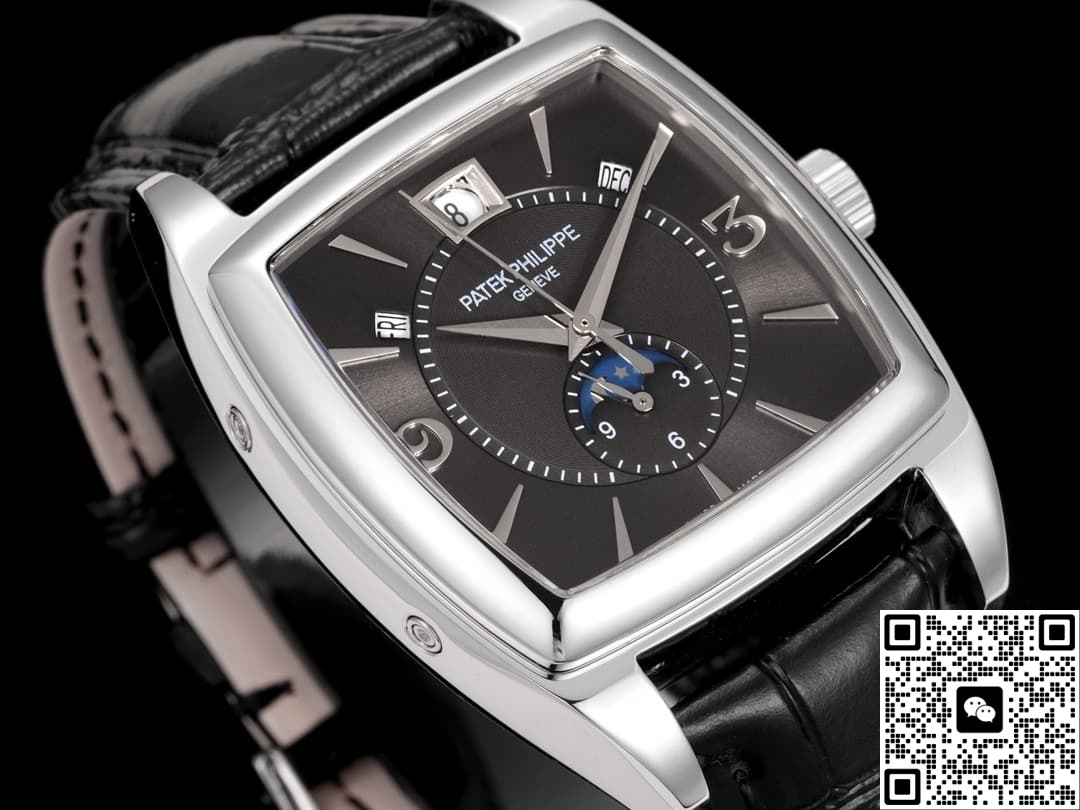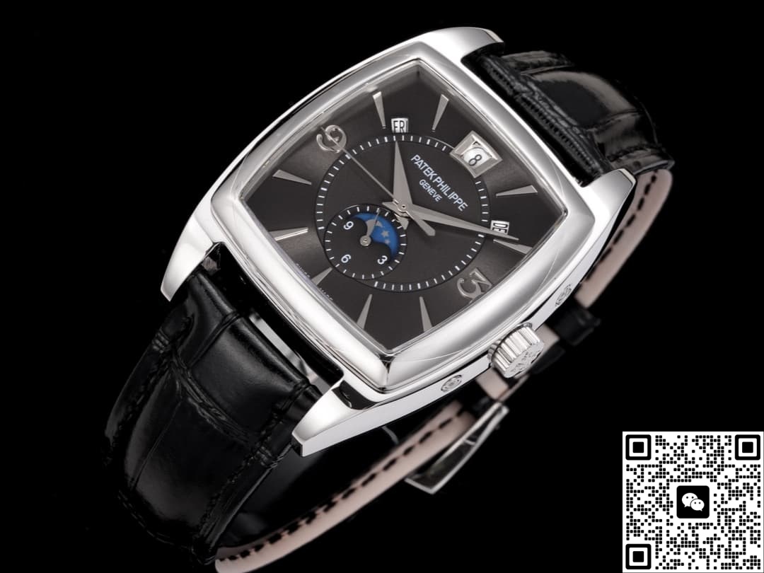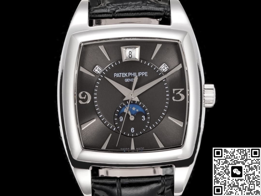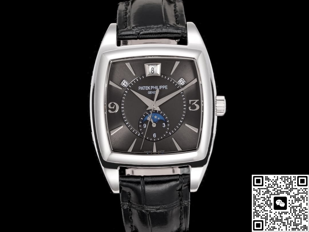 This Patek Philippe Complications Chronograph made by TW Factory is really well finished. The dark gray dial gives off a low‑key but luxurious vibe. If you look closely at the small circular sub‑dial in the middle, you’ll notice fine, even concentric rings—like the growth rings of an old tree, carrying that classic, vintage feel. The smooth, slim silver baton hour markers stand neatly around the dial, paired with Arabic numerals at 3 and 9 o’clock, making everything clean and balanced. The tonneau shape itself is full of character—smooth curves and a unique silhouette that feels retro and timeless. The leather strap is comfortable and adds to the premium look. The clear sapphire crystal lets you appreciate all the details easily. I’m personally fond of watches with a touch of vintage style, and since this replica watch is so well made, I’d say it’s definitely worth recommending.