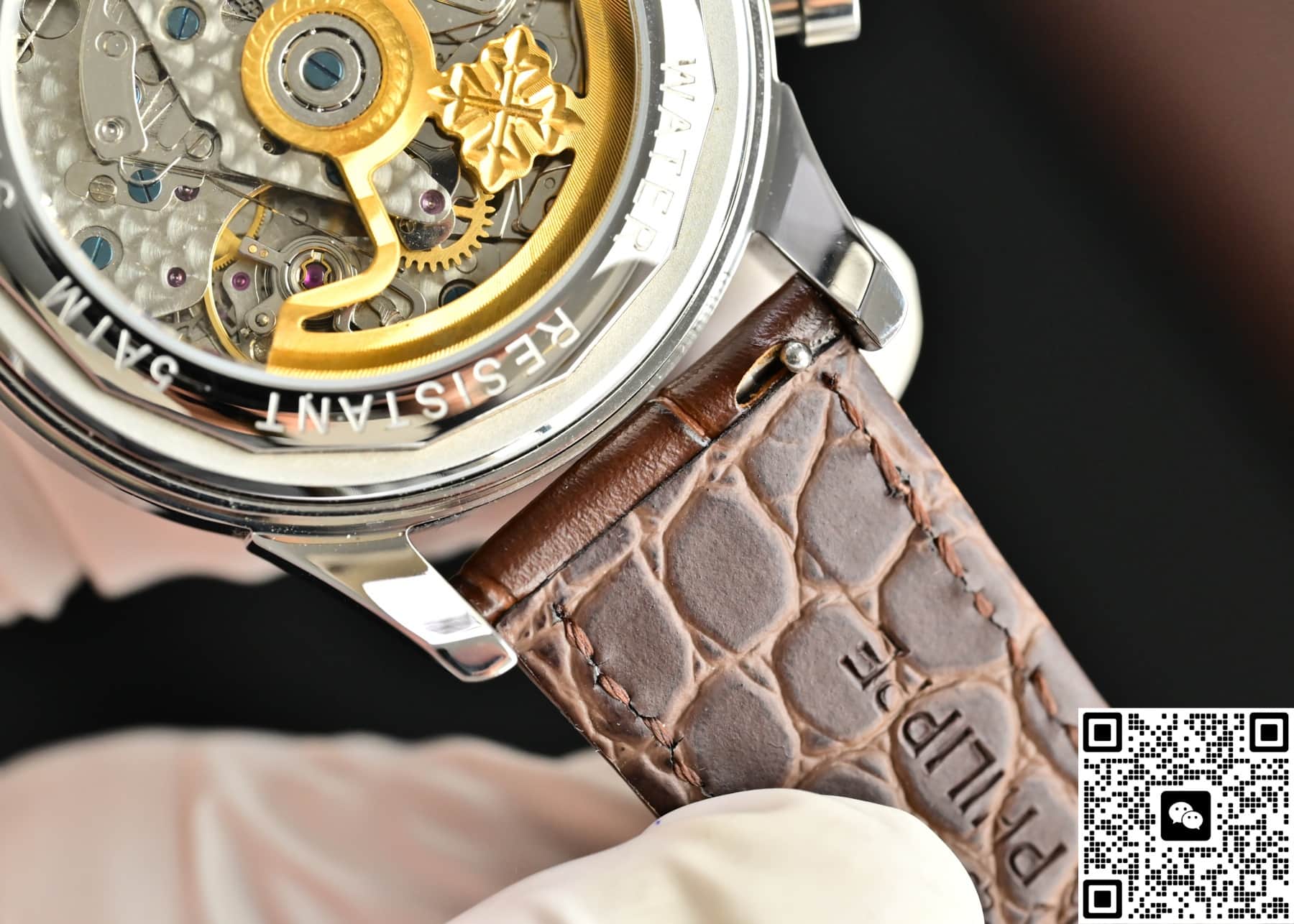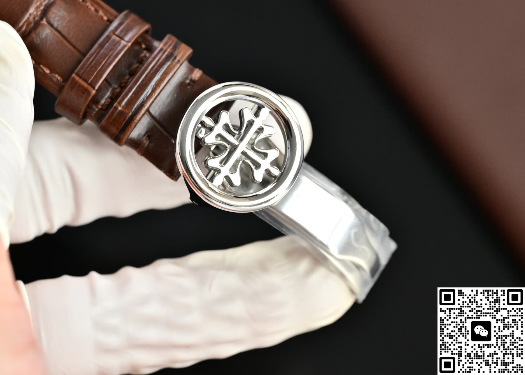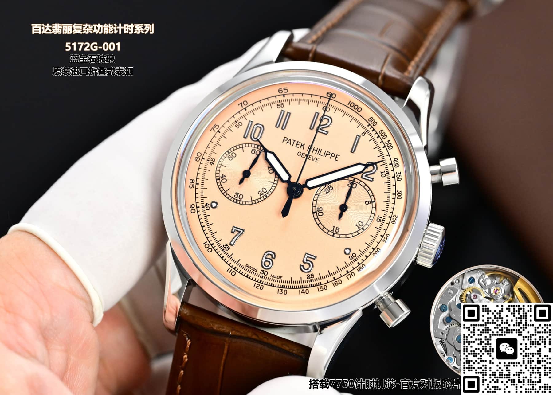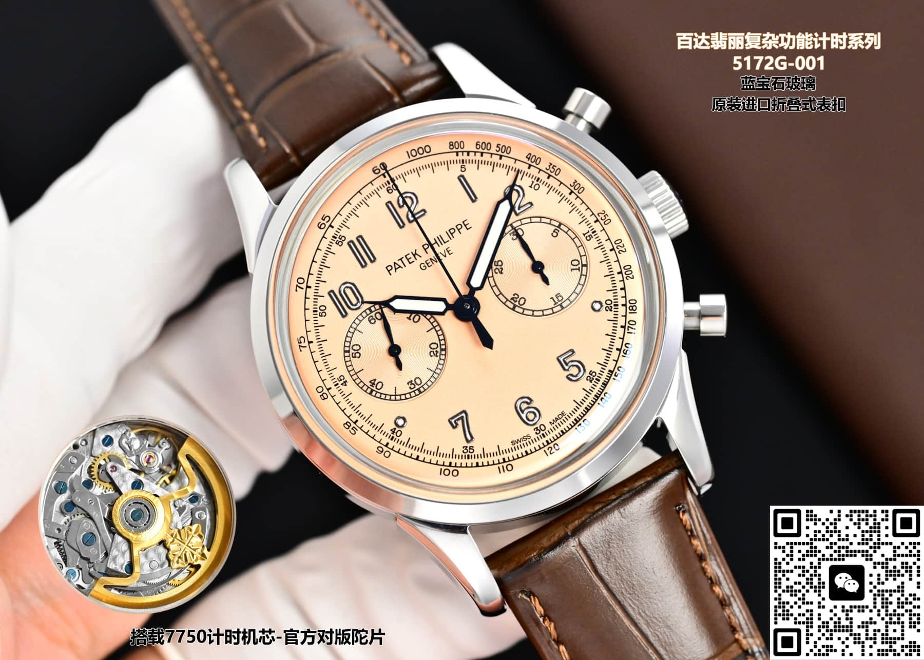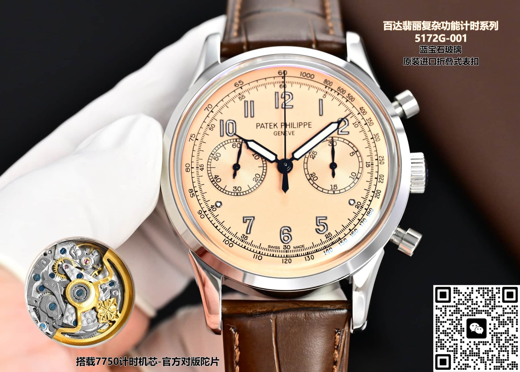 When you have the TW Factory Patek Philippe 5172G-010 replica watch in front of you, the first thing that catches your eye is the warm, metallic-salmon dial. It’s not as cold as a classic white dial, and it doesn’t give off the sporty vibe of a blue one. The white gold-plated case naturally tones down that softness, and the 41mm diameter with 11.45mm thickness sits right between dressy and casual—fits under a cuff without trouble, and doesn’t look flashy over a shirt.