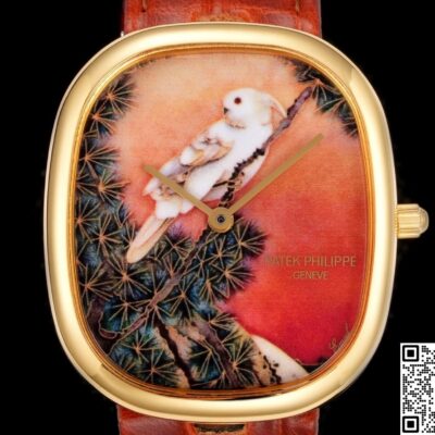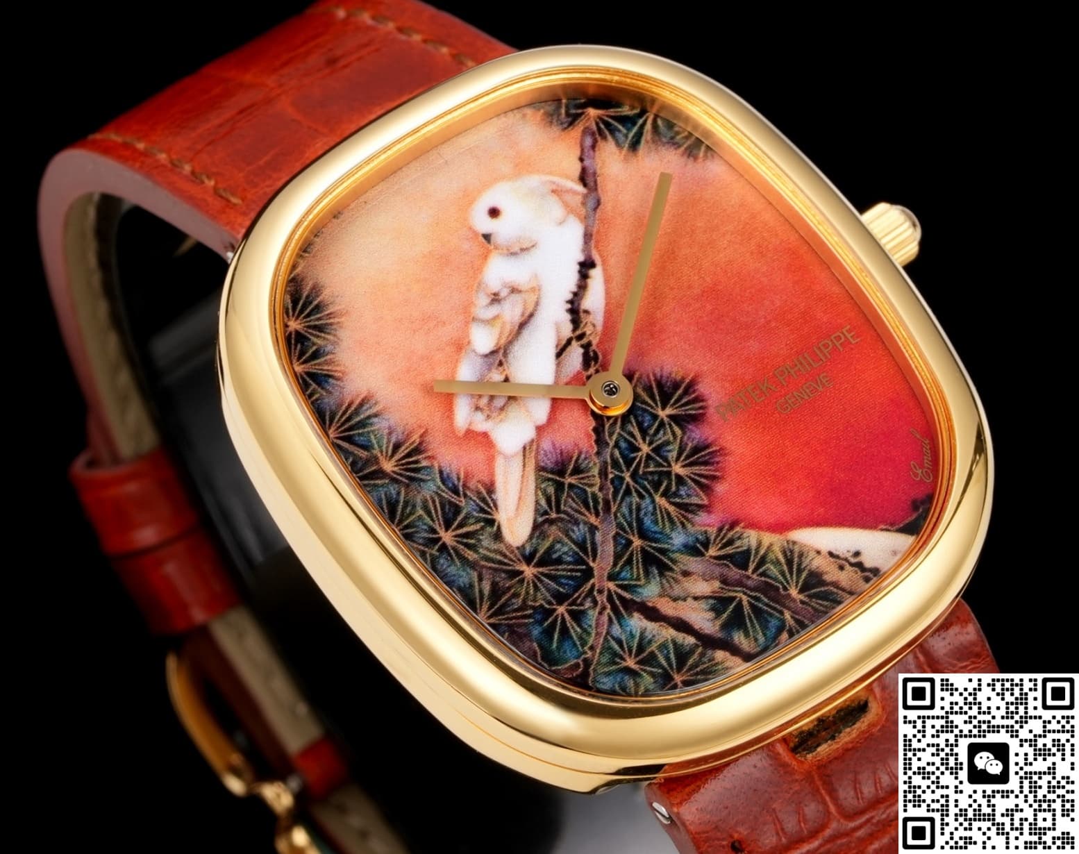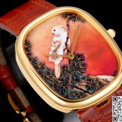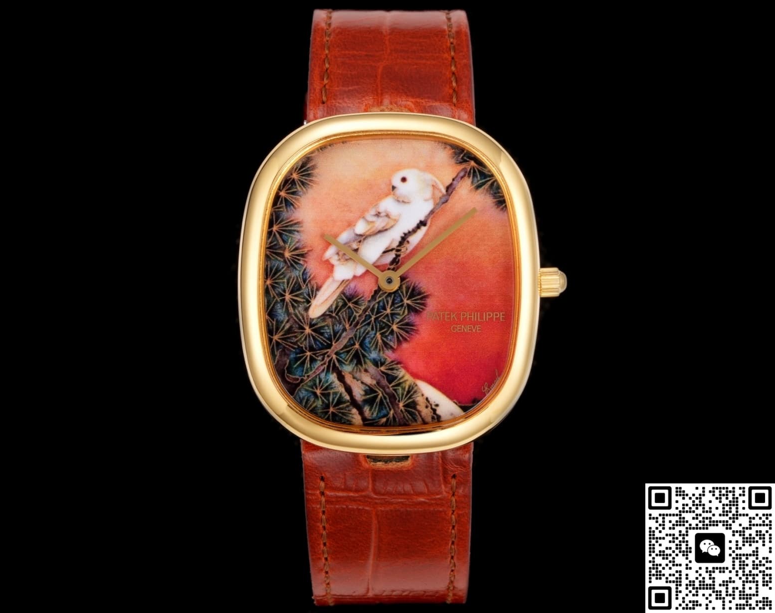 The two golden hour and minute hands on the dial have clean, sharp edges. They are very simple and blend perfectly with the dial’s picture, not looking out of place at all. The golden text in the bottom-right corner is neat and clear, fitting very well with the orange background. Compared side-by-side with the real one, this Patek Philippe’s exterior design and attention to detail are just as good as the original. Wearing it on your wrist feels full of artistic flair.