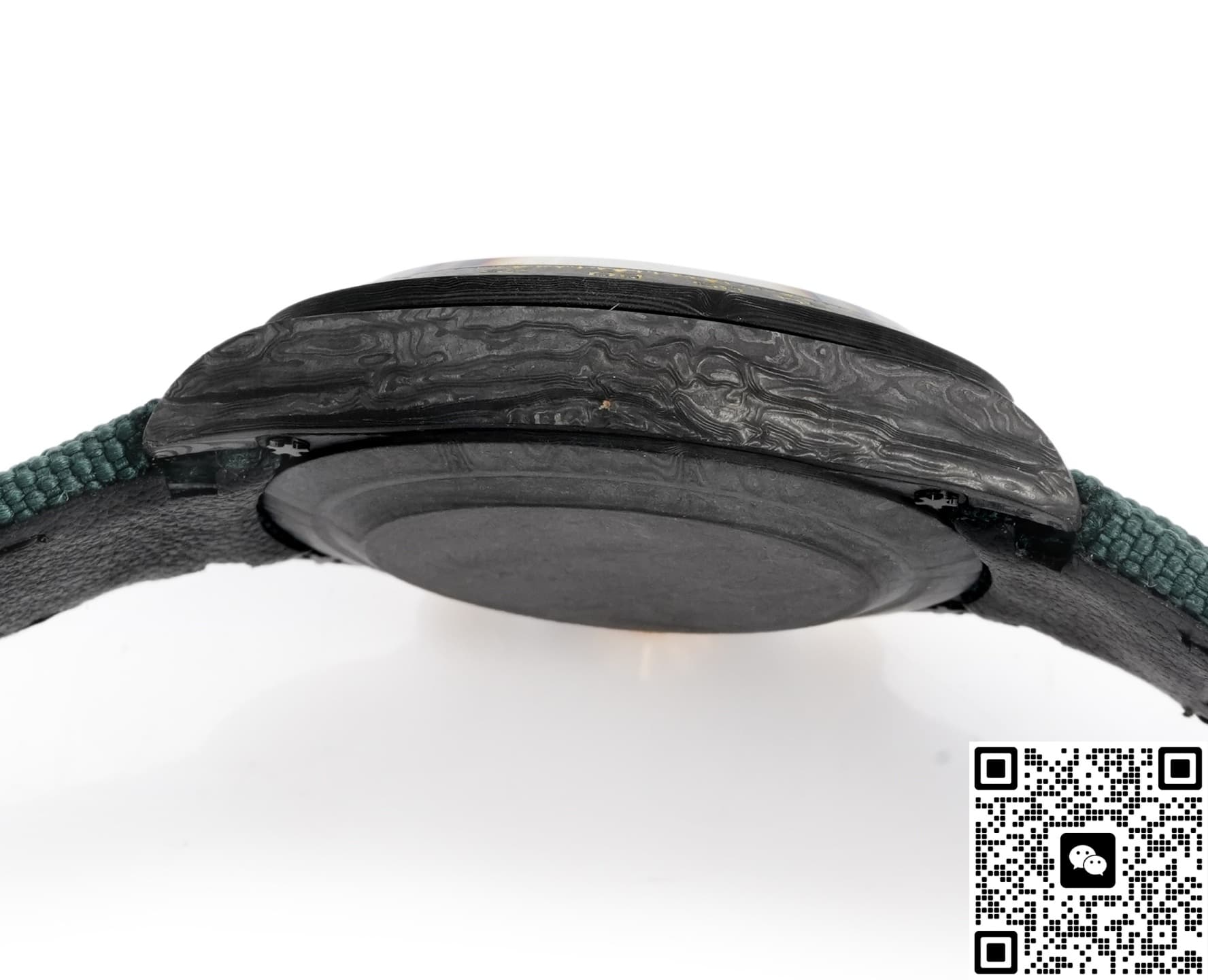 What really makes this watch stand firm in the word modification is the composite practice of green braided strap and fluororubber. The outer layer of high-strength nylon provides air holes and fabric texture, and the inner layer of 75-degree fluororubber is waterproof and sweat-proof. The two materials are molded once in a high-temperature mold and then fixed by hand sewing. The part of the back of the strap that contacts the wrist is made into a fine frosted surface, which will not form the sticky vacuum feeling of traditional rubber after sweating; The nylon surface layer allows the wrist to be as thin as 16 cm, and the strap will not be loose because of the light meter.