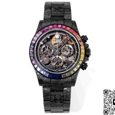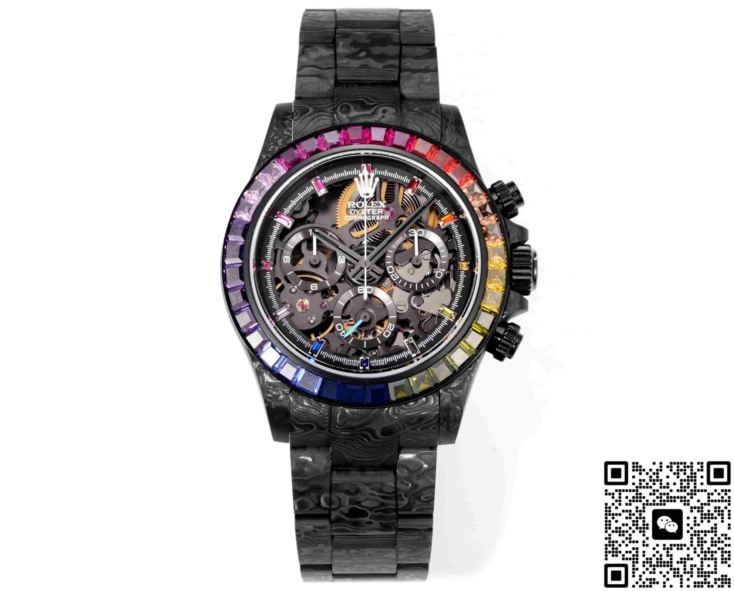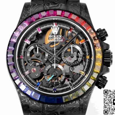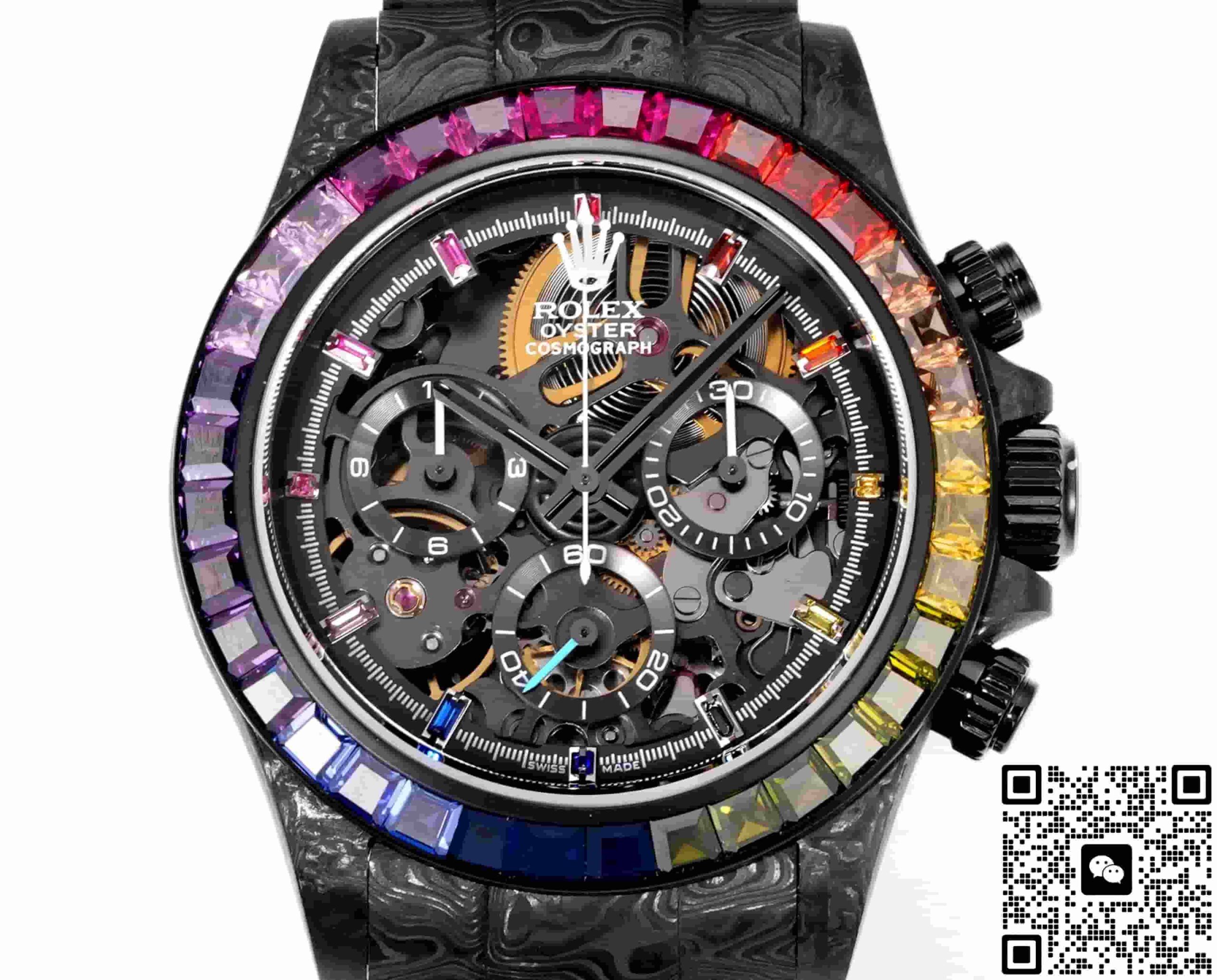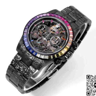 This TW factory modified Rolex Daytona replica watch is really popular. Rolex watches are super well-known. It’s one of the most famous, recognizable, and prestigious watch brands in the world. It’s pretty much become a symbol of luxury, precision, durability, and status. I think everyone dreams of owning a Rolex at some point. This watch uses a carbon fiber case and bracelet, paired with a rainbow bezel, and it actually gives a nice surprise. It mixes sporty tech with luxury jewelry, breaking the usual style rules of traditional watches, and has this cool mixed-match beauty. I’ve worn it for a while and it’s been pretty stable, so let’s take a look at the craftsmanship and details of this TW factory watch.