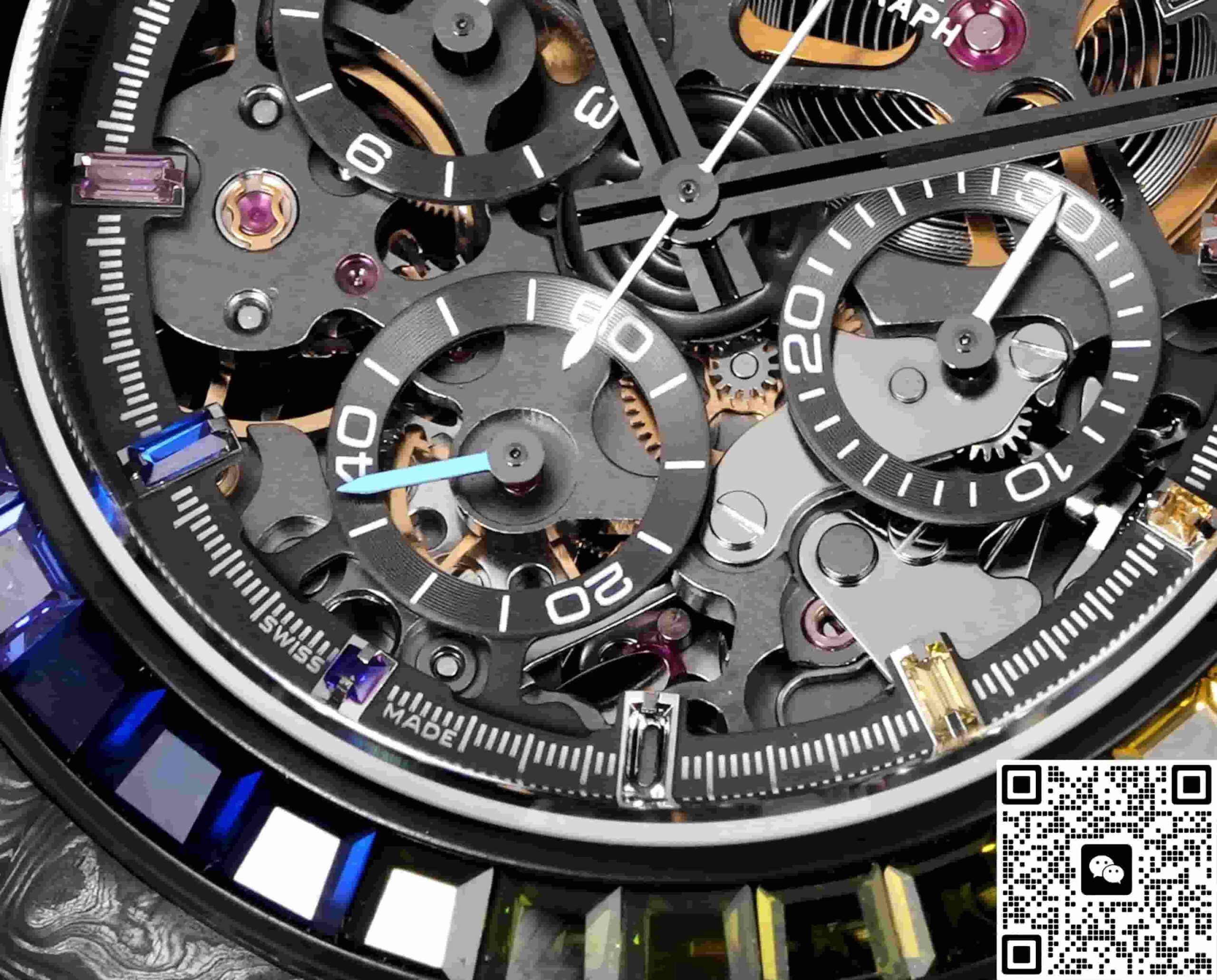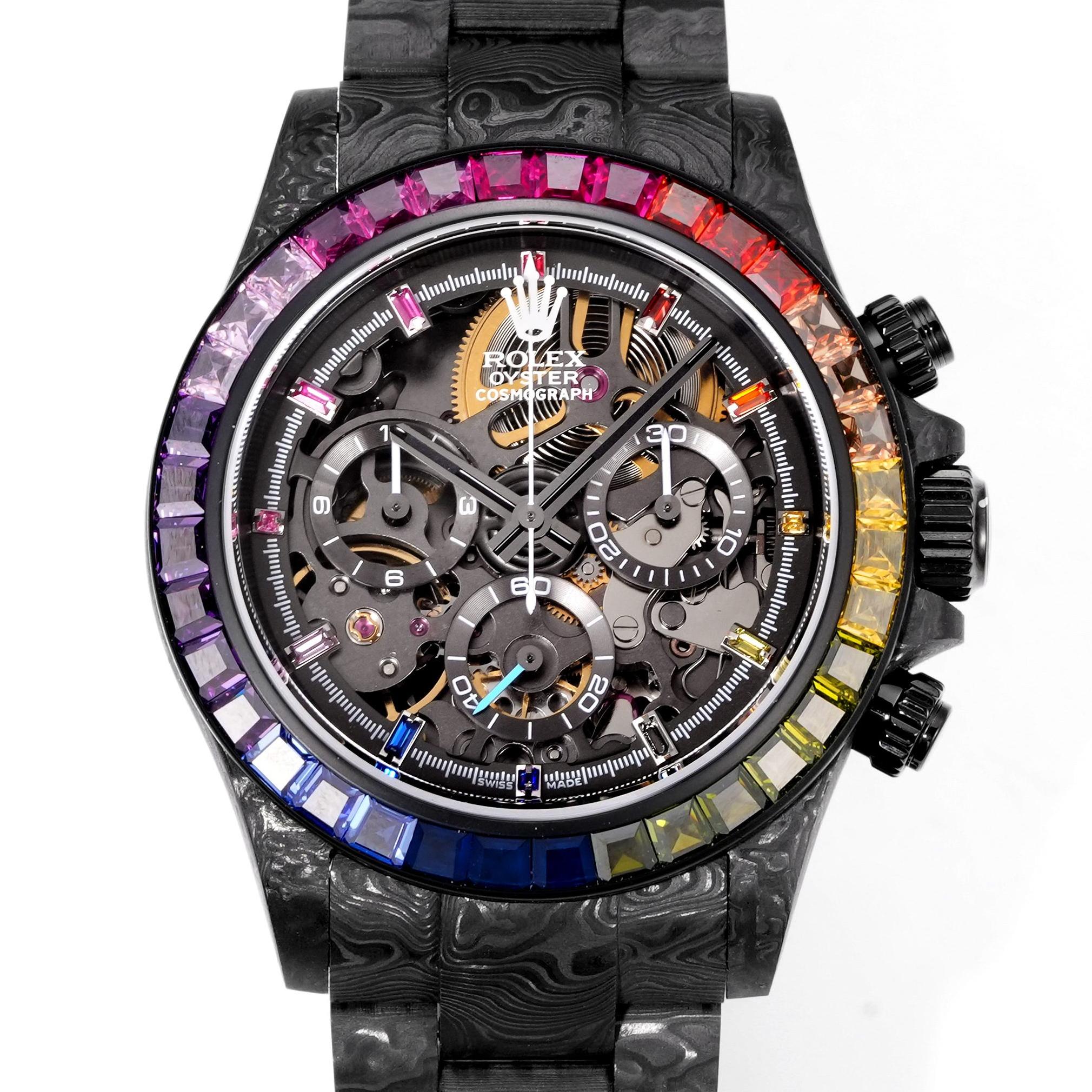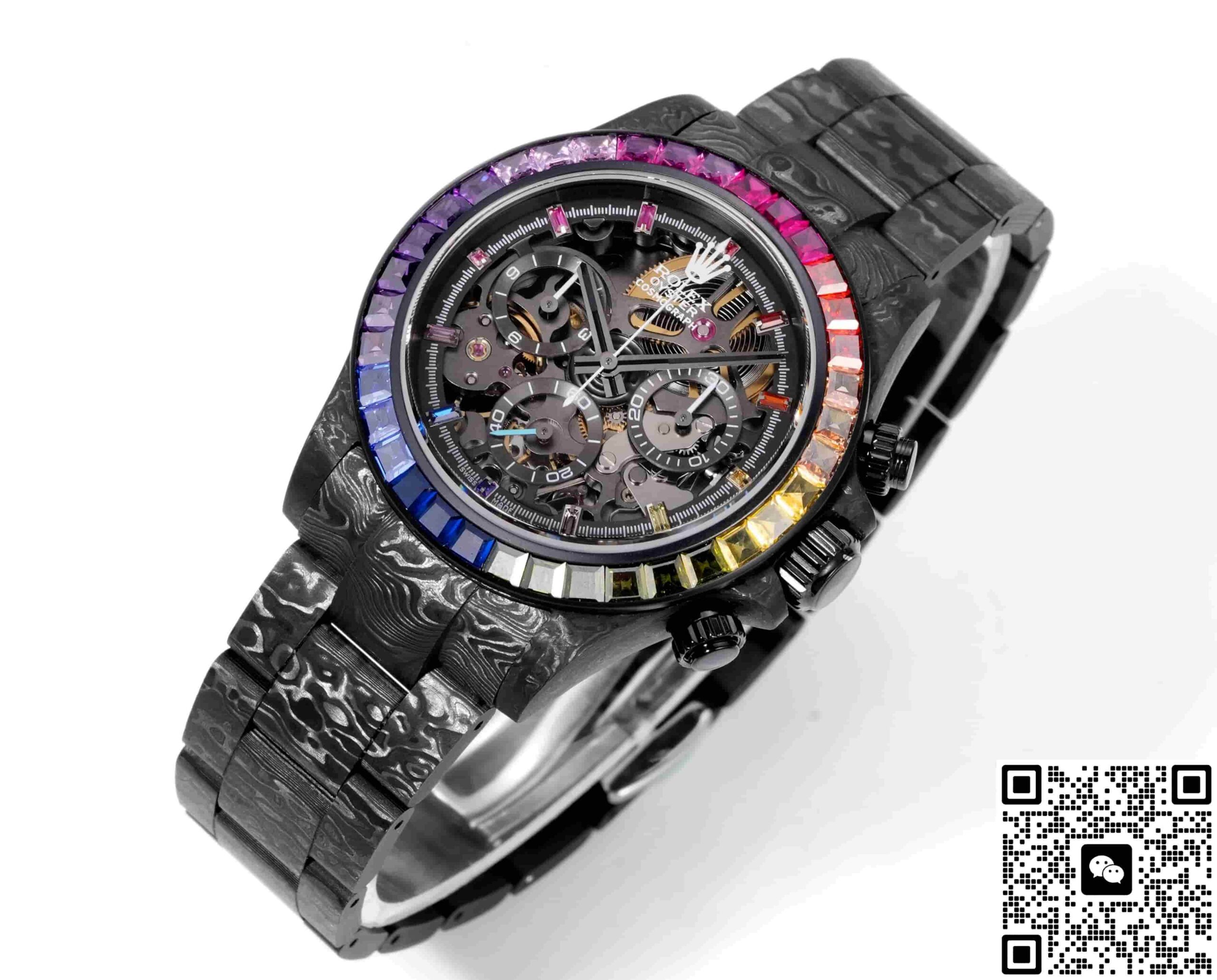 This TW factory modified Rolex Daytona replica watch is really popular. Rolex watches are super well-known. It’s one of the most famous, recognizable, and prestigious watch brands in the world. It’s pretty much become a symbol of luxury, precision, durability, and status. I think everyone dreams of owning a Rolex at some point. This watch uses a carbon fiber case and bracelet, paired with a rainbow bezel, and it actually gives a nice surprise. It mixes sporty tech with luxury jewelry, breaking the usual style rules of traditional watches, and has this cool mixed-match beauty. I’ve worn it for a while and it’s been pretty stable, so let’s take a look at the craftsmanship and details of this TW factory watch.