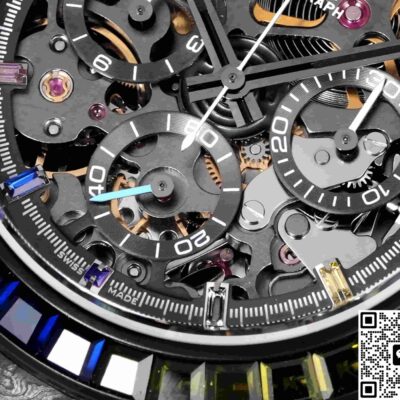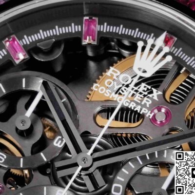 The dial has a skeleton design, so you can see the movement working inside, which adds a lot of mechanical beauty. The hour markers on the dial are also colored, matching the rainbow bezel nicely. The dial keeps the Daytona’s classic three-eye chronograph layout, and the three sub-dials are also skeletonized. The overall design doesn’t mess with Rolex’s classic look but adds something extra to look at with the skeleton style. TW factory’s watch is a replica watch with a lot of design sense.