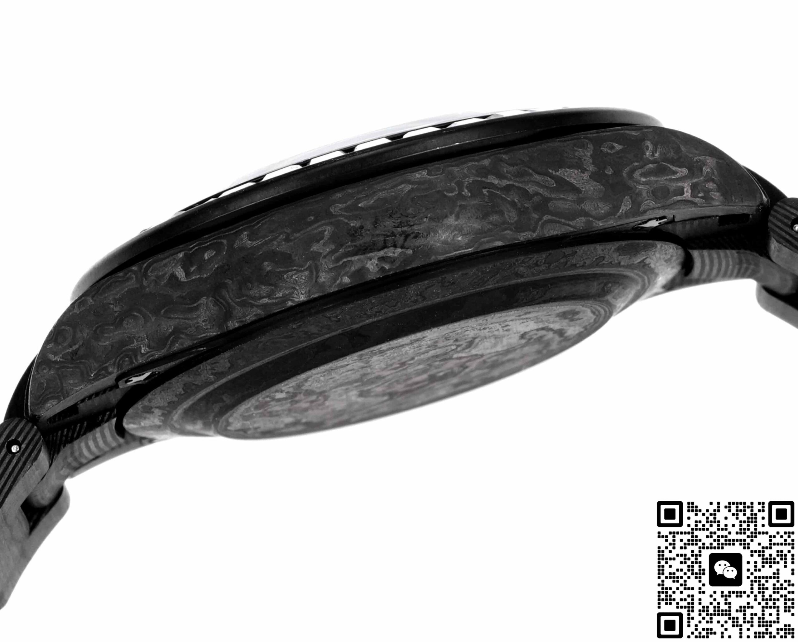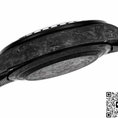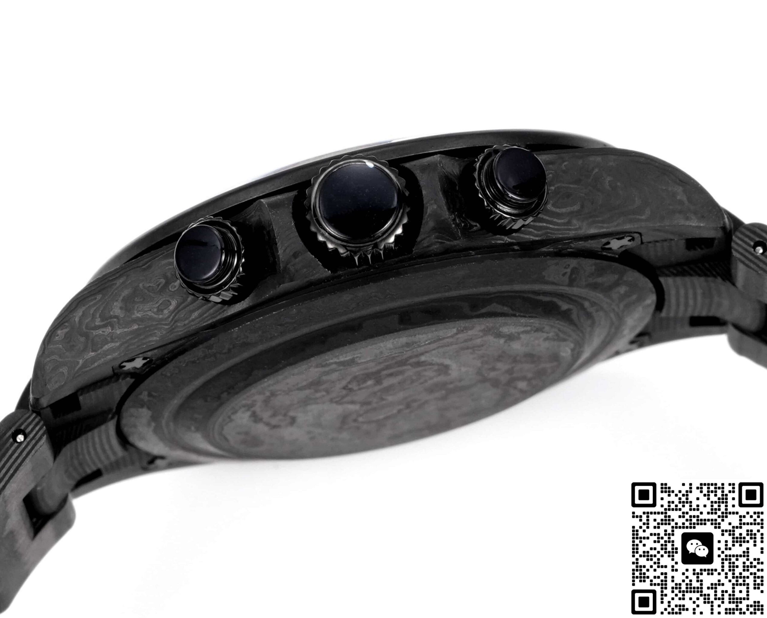 My answer is: very comfortable. Not just comfortable, but also good-looking. The watch diameter is the usual 40mm size for a Rolex Daytona, which fits just right. Actually, this size works for most people—it doesn’t feel bulky like some big dial watches do. On the wrist, it looks really delicate and nice. The original case is made of steel, but TW factory made this carbon fiber version, and it’s super light. You barely feel it on your hand, and even after wearing it for a long time, it doesn’t leave any marks. Really easy and convenient to wear. The carbon fiber pattern on the case is unique—the black waves look like tree rings, and under light, it has a special charm. Paired with the carbon fiber bracelet, it gives off a strong tech and sporty vibe. And it feels smooth to the touch, doesn’t scratch your skin. My first impression of this watch was pretty good, and the details and workmanship didn’t disappoint either.