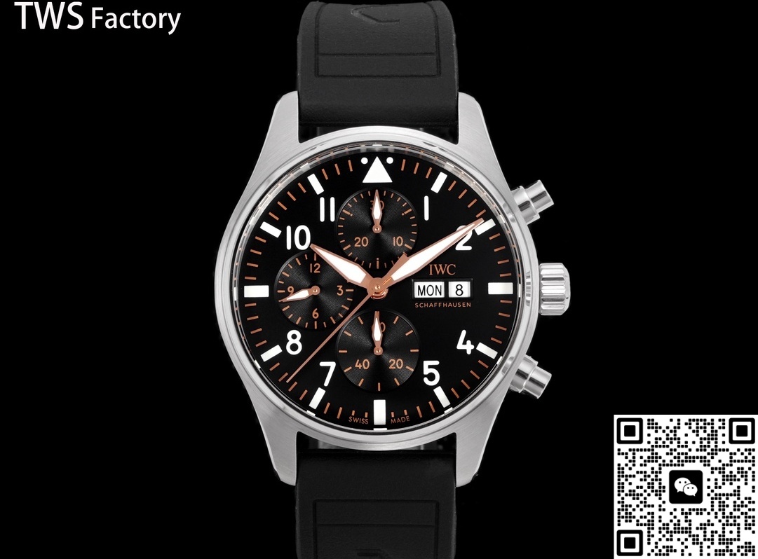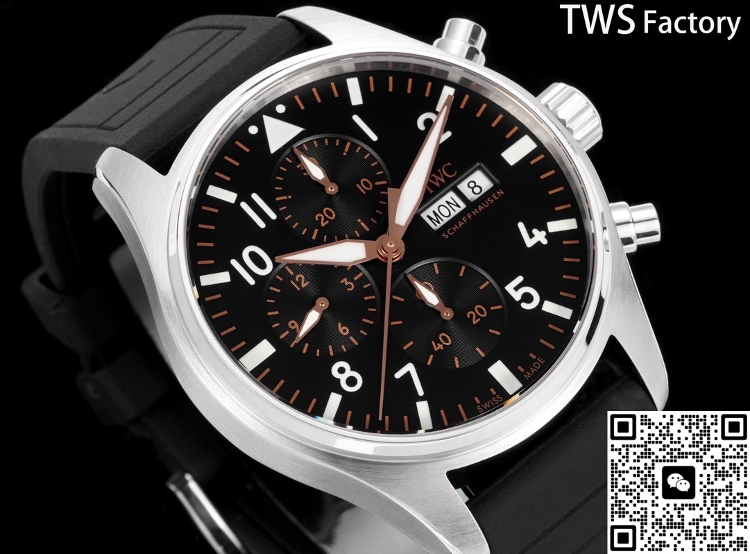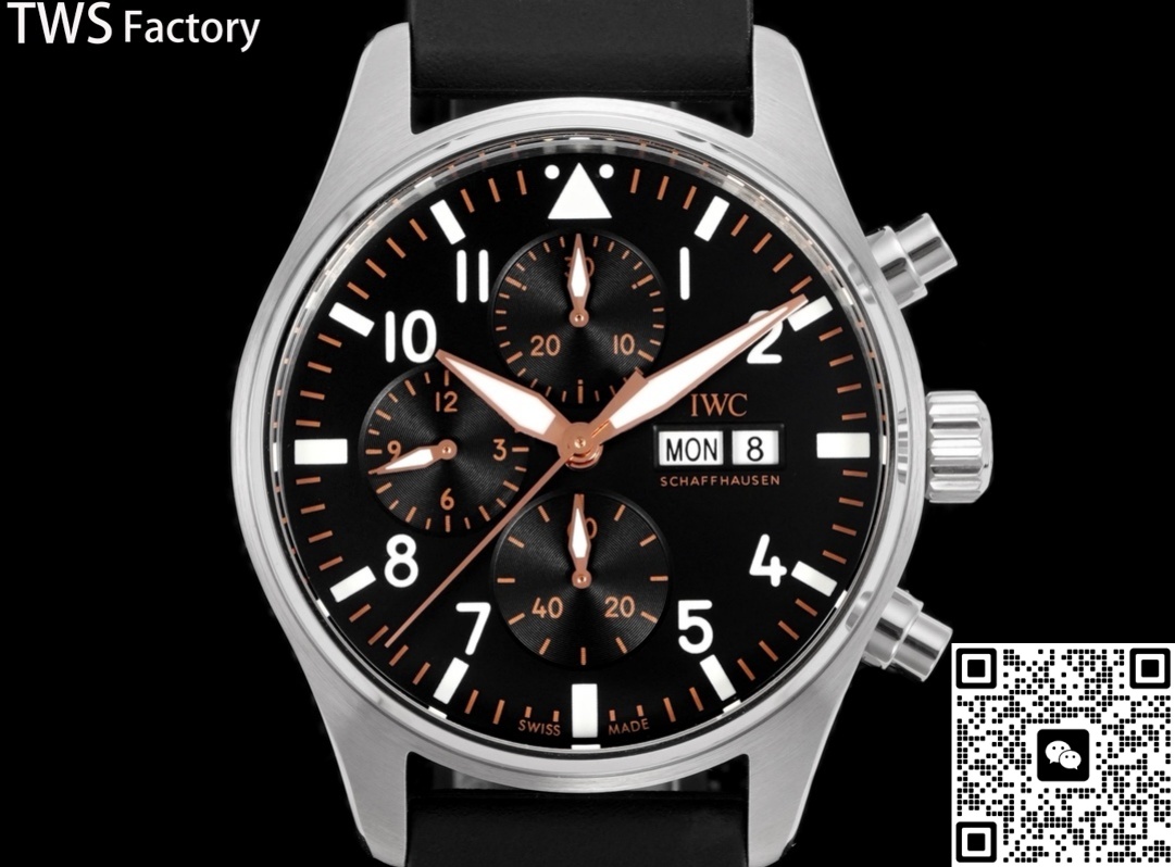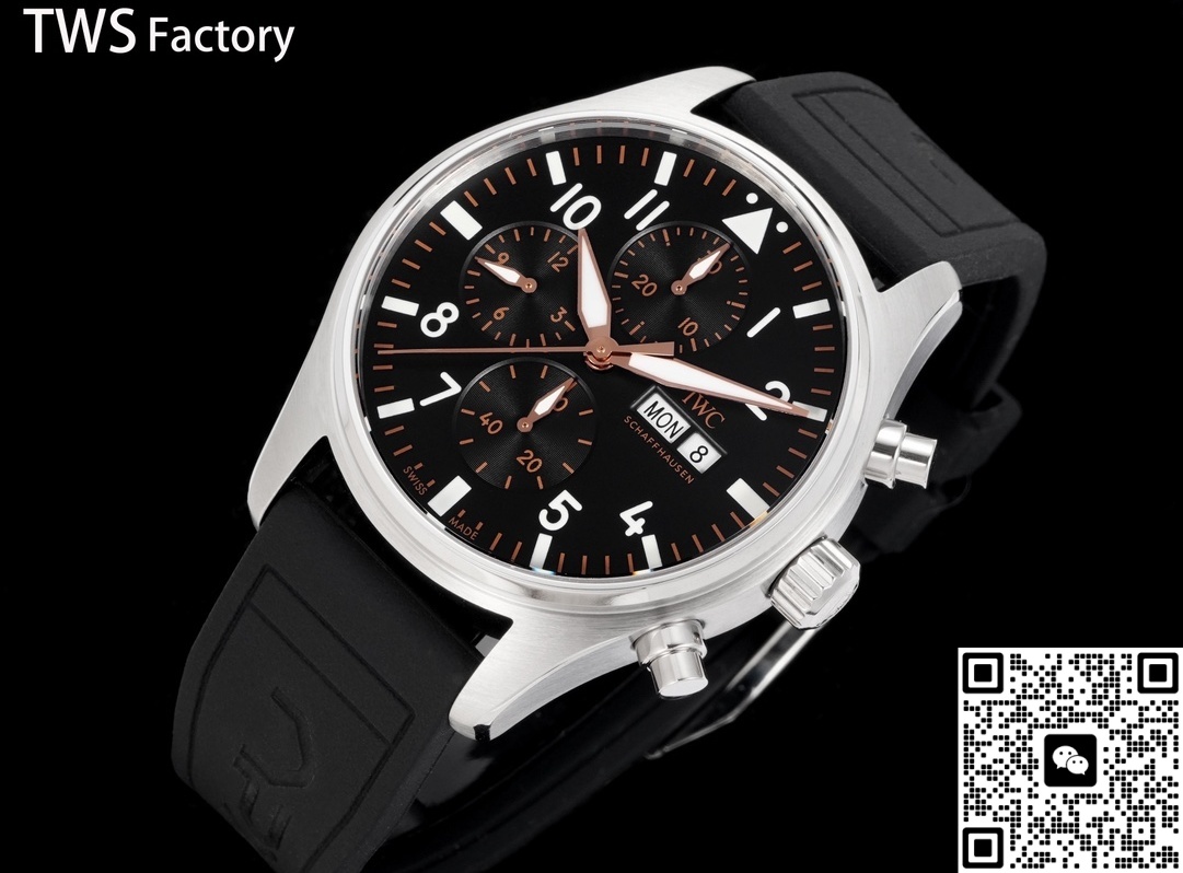 Today, I’ve got this watch from the TWS factory—a replica watch of the IWC Pilot’s watch, model IW378009. TWS is one of the well-known factories in the industry, making high-end clone watches of lots of luxury brands like Rolex, Omega, and Patek Philippe. They position themselves in the high-tier segment, paying close attention to detail, using good materials and movements. This watch was released in April 2025. This new Pilot chronograph is actually the “APXGP” special edition, the same model worn by the APXGP racing team—kind of like the “screen-accurate” version. It’s been pretty popular among watch enthusiasts. With a 43mm case, it doesn’t feel bulky on the wrist and actually carries a strong presence. The watch features a black, white, and gold color scheme, with racing-inspired elements. It gives off a free, unrestrained, and energetic vibe. Personally, I really like this kind of sporty watch style.