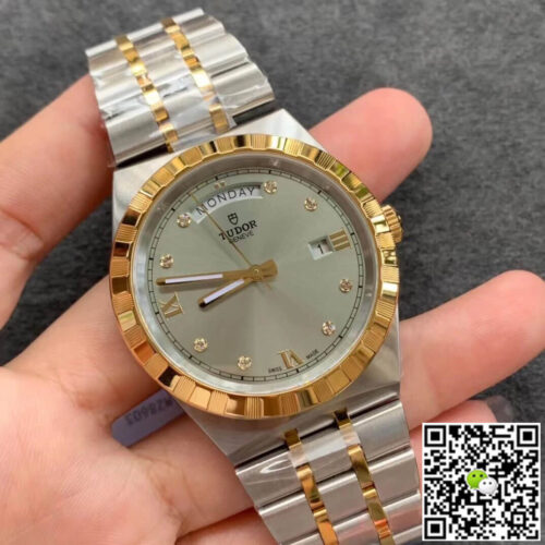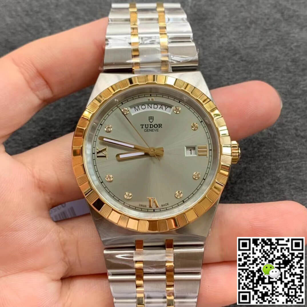 Best V7 Factory Replica Tudor Royal M28603-0002 Gold Bezel For Sale – Replica Watch Wholesale.The case is perfectly polished using stainless steel CNC technology. Using Swiss ETA2834 movement. The diameter of the watch is standard size 41mm. Gold stainless steel bezel with spaced pits on the smooth surface. The watch mirror is made of sapphire scratch-resistant mirror to maximize transparency. The dial has been specially treated to have a sunray effect, set with diamonds, frosted in the middle and finely polished at intervals.